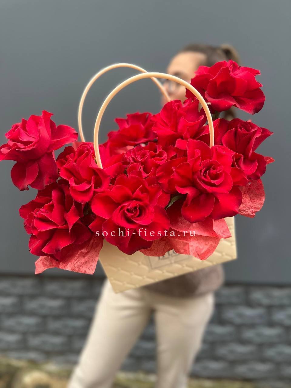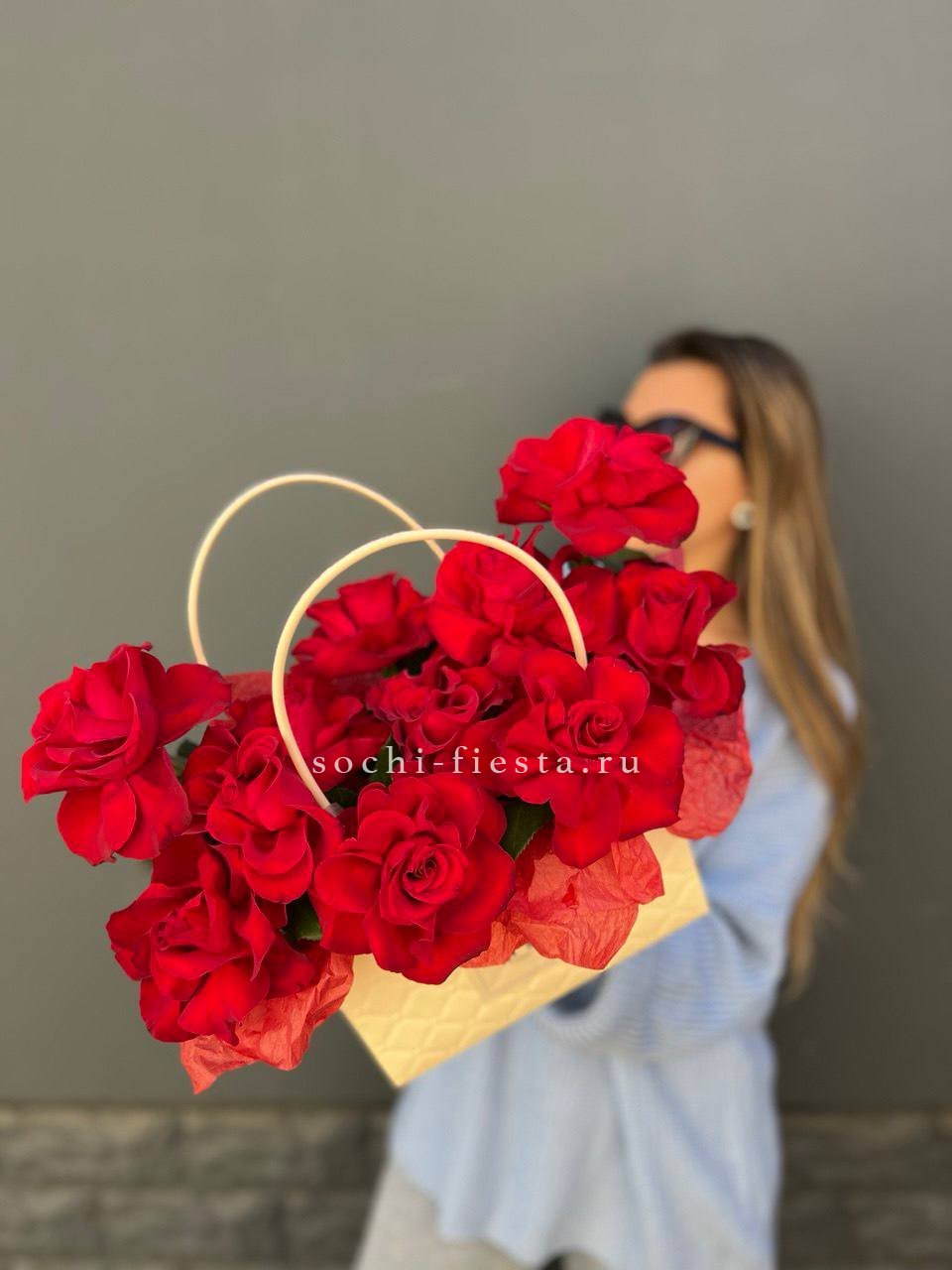 пионовидные кустовые розы, альстромерии, сумочка, лента.
