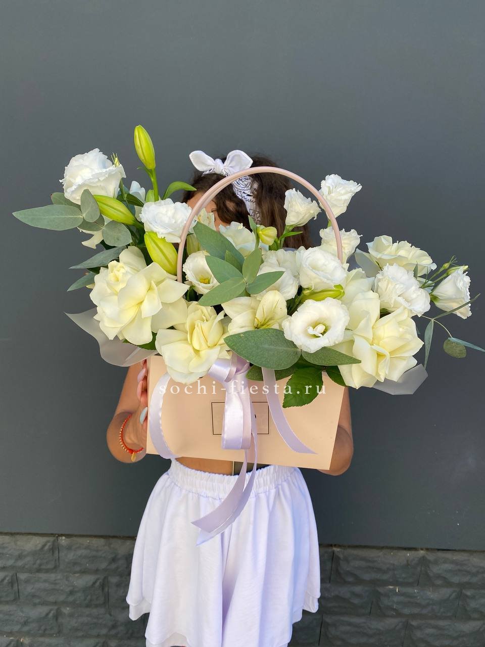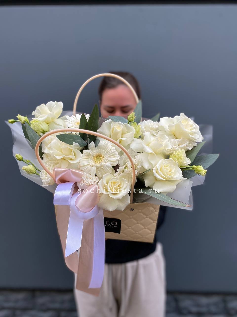 джумилия, гербера, мисти баблс, диантус, хлопок, лагурус, сумочка.