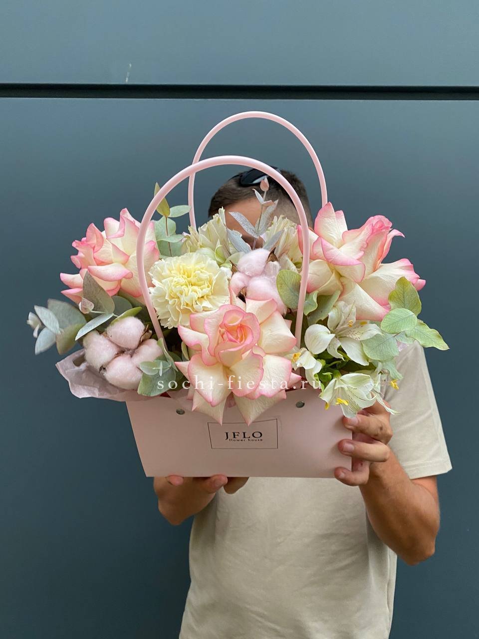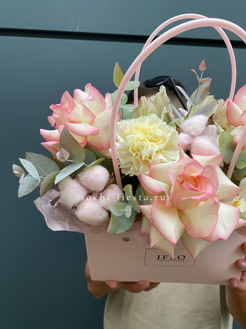 Яркая композиция в удобной сумочке объединяет розы Джумилия с герберами и воздушными соцветиями. Хлопок и лагурус добавляют природной легкости, а диантус создает цветовую динамику.