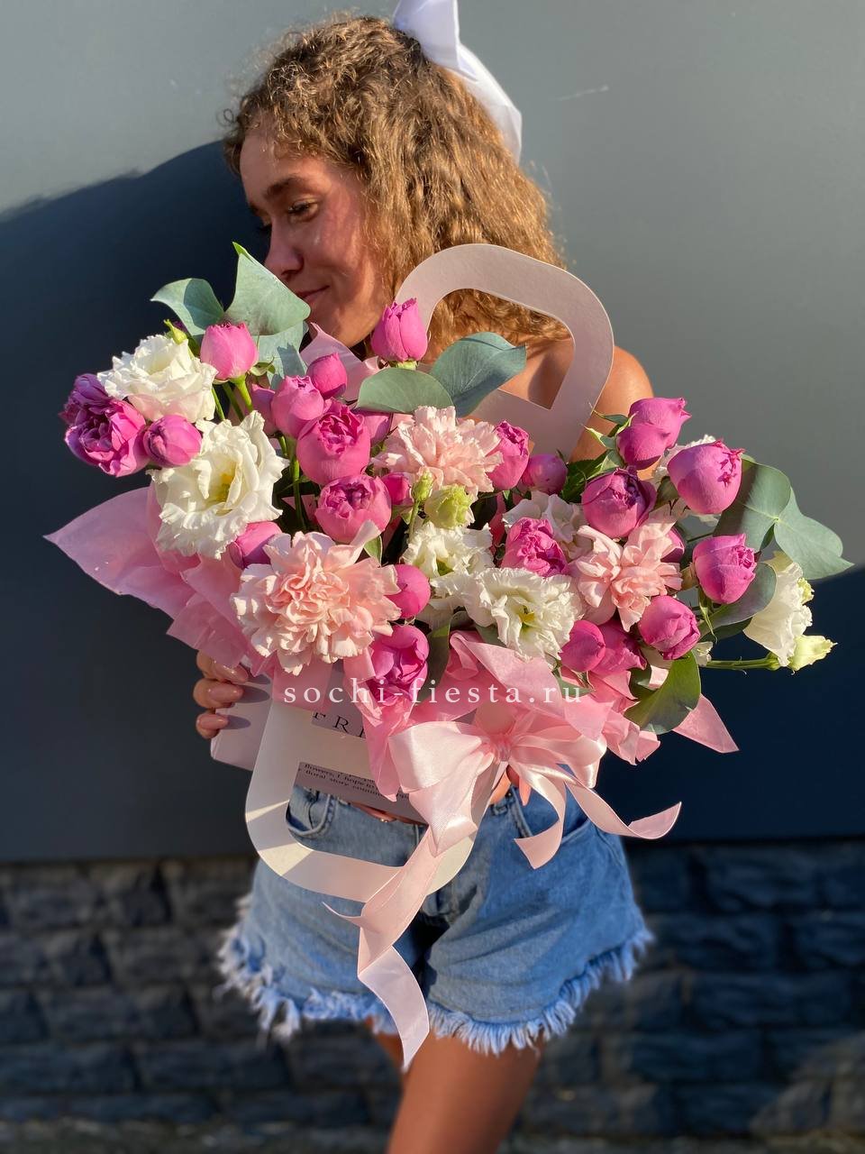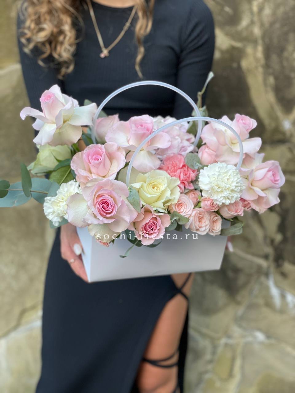 мисти баблс, диантус, эустома, сумочка.