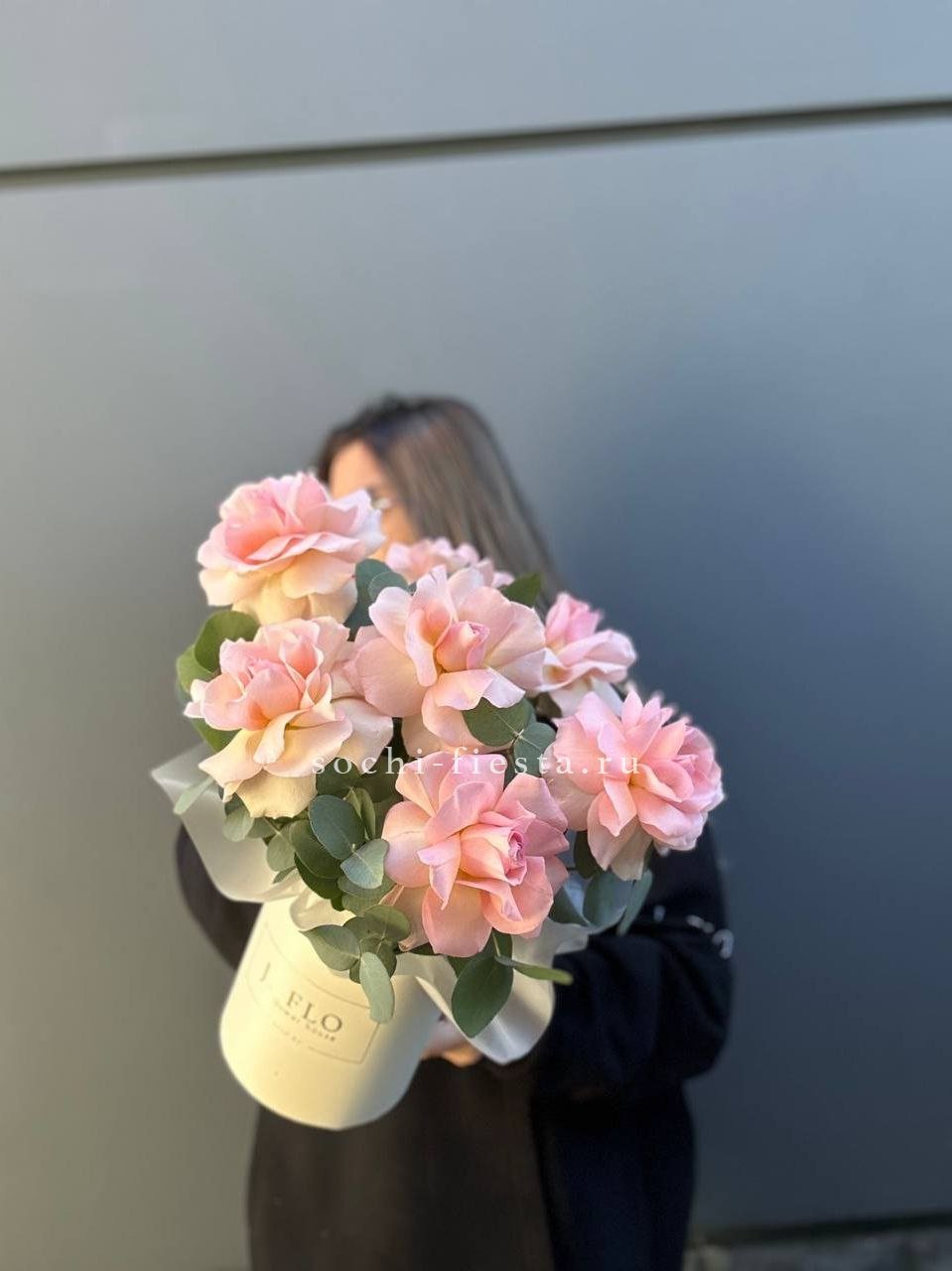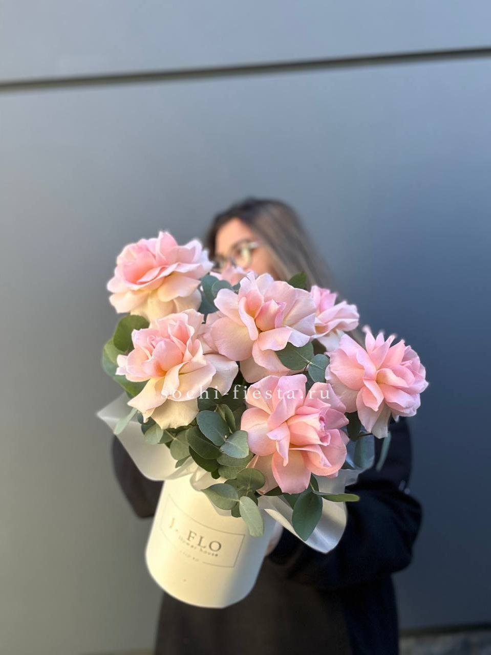 Статица добавляет воздушную текстуру между плотными бутонами роз и эустомы. Эвкалипт связывает композицию в единое целое с природной легкостью.