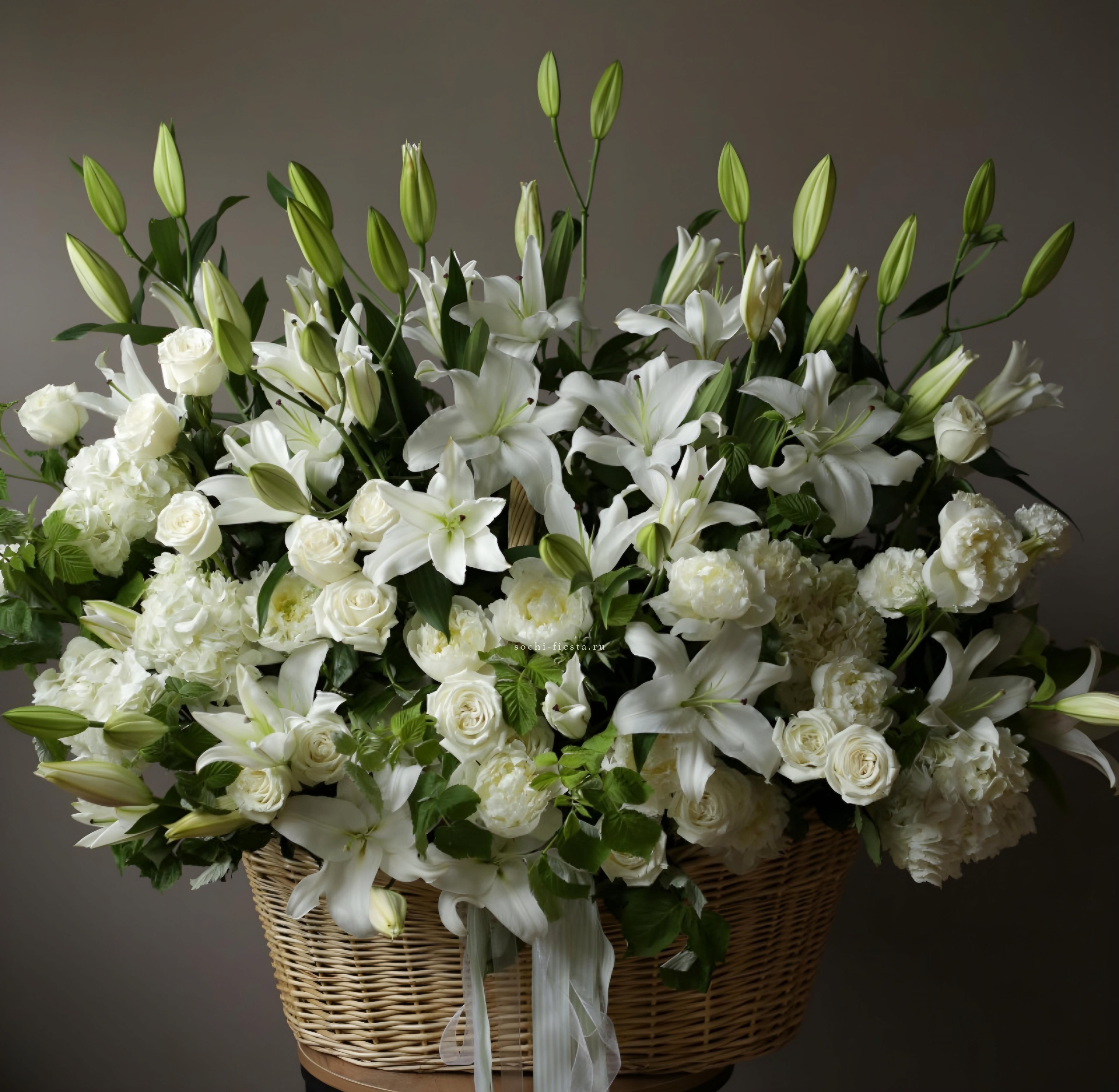 Корзина вмещает двести один бутон, образующих пышное цветочное полотно. Классическая форма подачи позволяет разместить композицию в любом пространстве без необходимости искать вазу. Впечатляющий объем для важных событий.