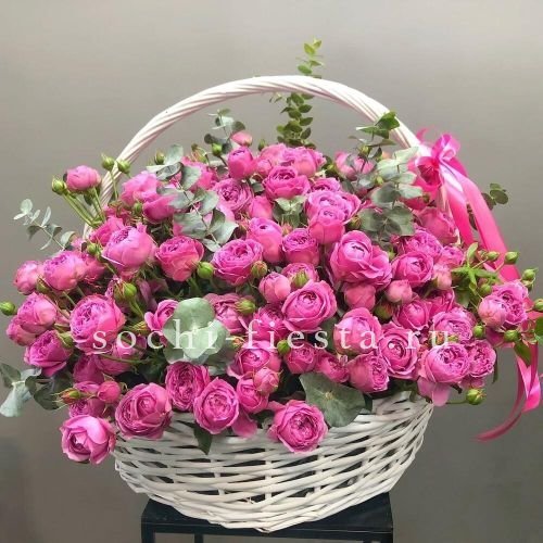Пышная корзина объединяет пионовидные розы с воздушной гортензией и многослойной эустомой. Матиолла и лимониум добавляют глубину композиции, а диантус создает мягкие переходы между крупными бутонами.