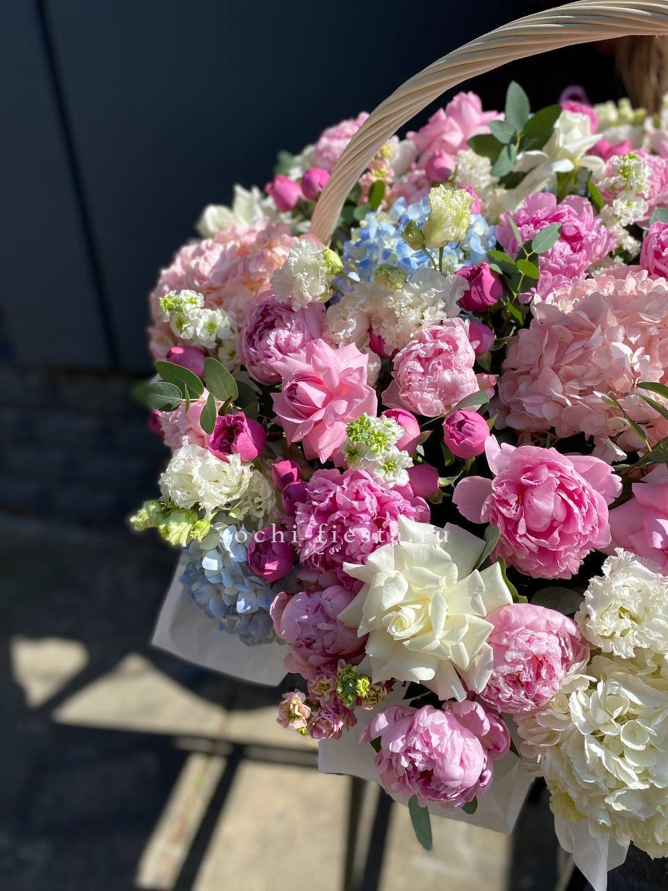 гортензии, мисти баблс, эвкалипт (круглолистый или остролистый в зависимости от сезона), лента, светлая корзина D40.