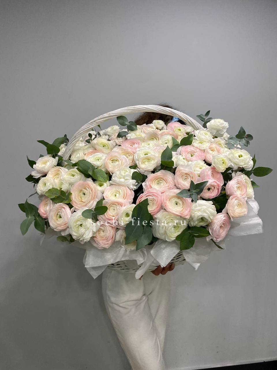 Пышная шапка гортензий в обрамлении воздушных соцветий Мисти Баблс создаёт объёмную композицию в светлой корзине. Эвкалипт добавляет зелени и завершает природную гармонию.