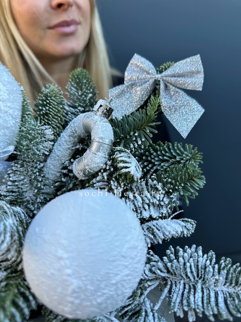 Белоснежные сапожки и хвоя нобилиса собраны в компактную праздничную форму. Матовые шары добавляют объём и завершают зимнюю картину без лишних деталей.