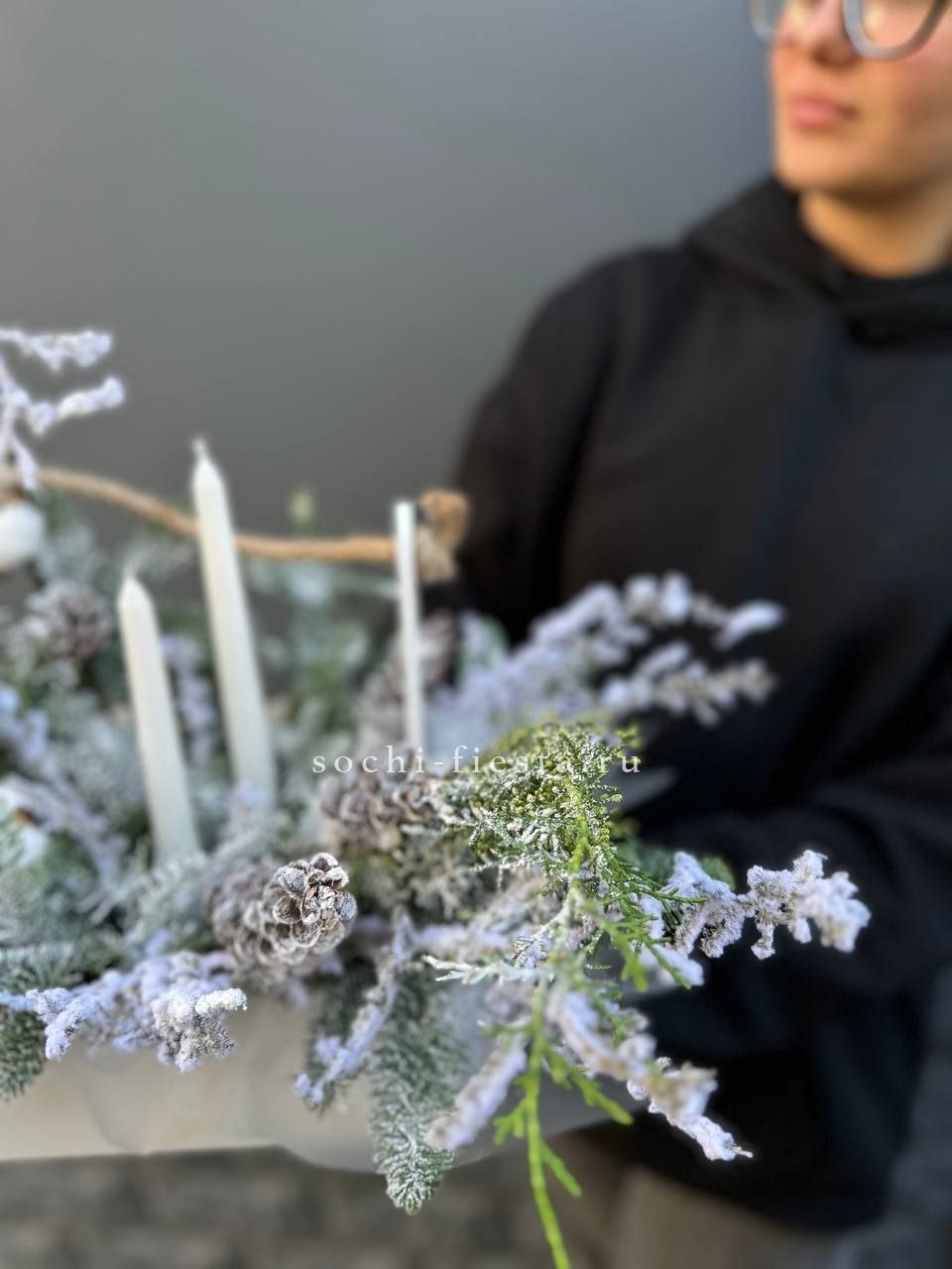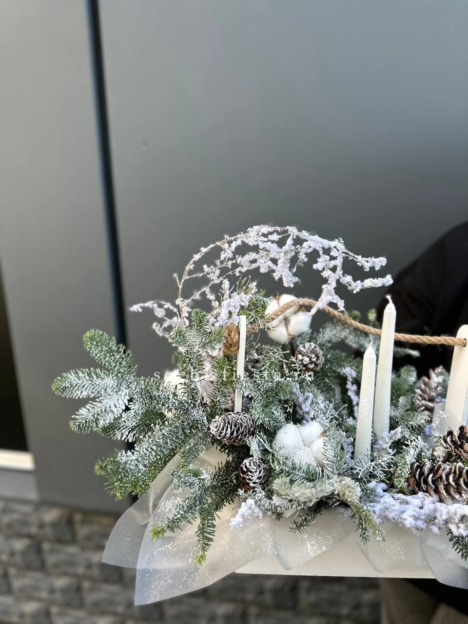датский нобилис, хлопок, деревянный ящик, шишки, аспарагус (или аналог), свечи Готовая композиция может иметь незначительные внешние отличия от примера на фотографии.