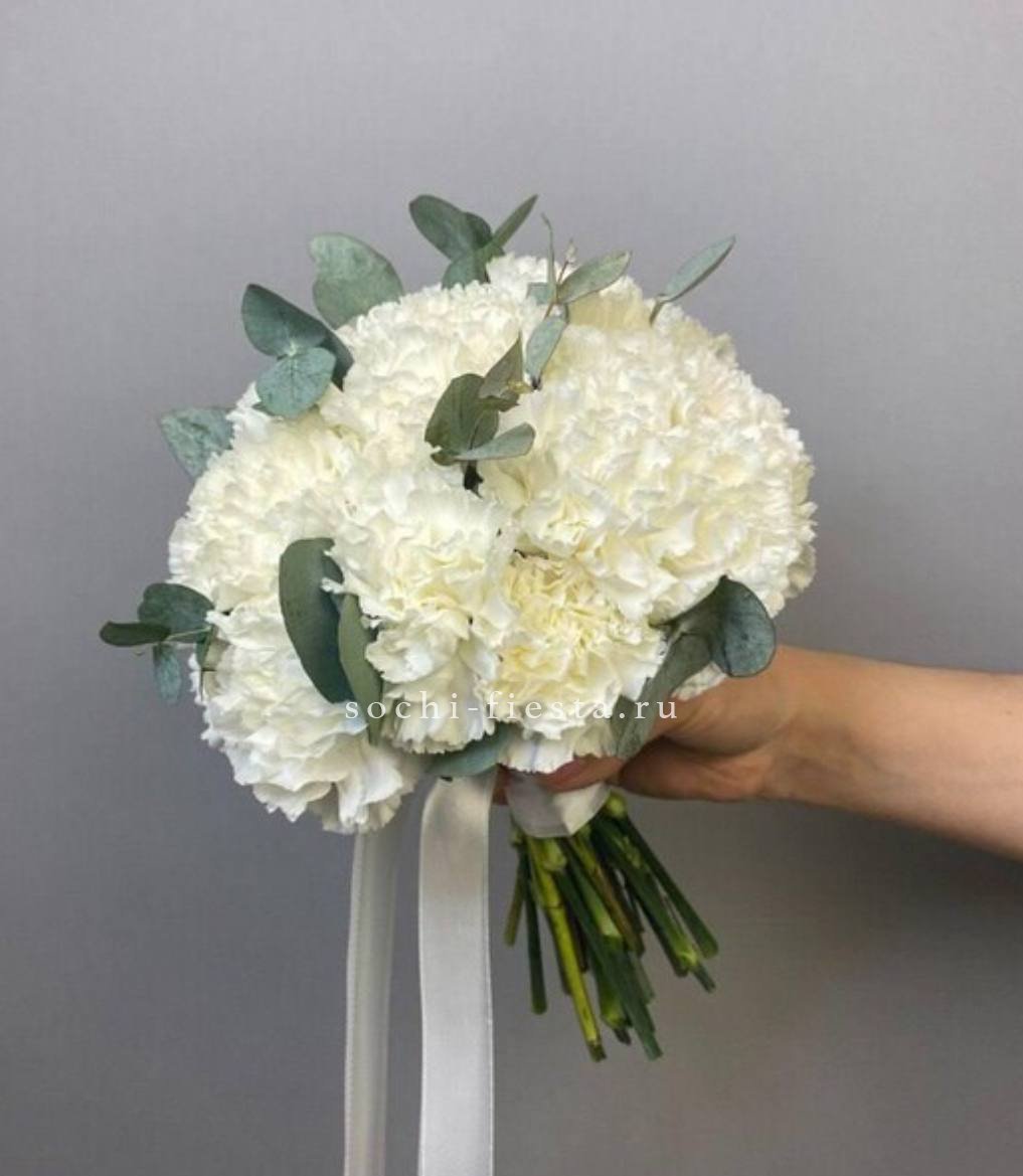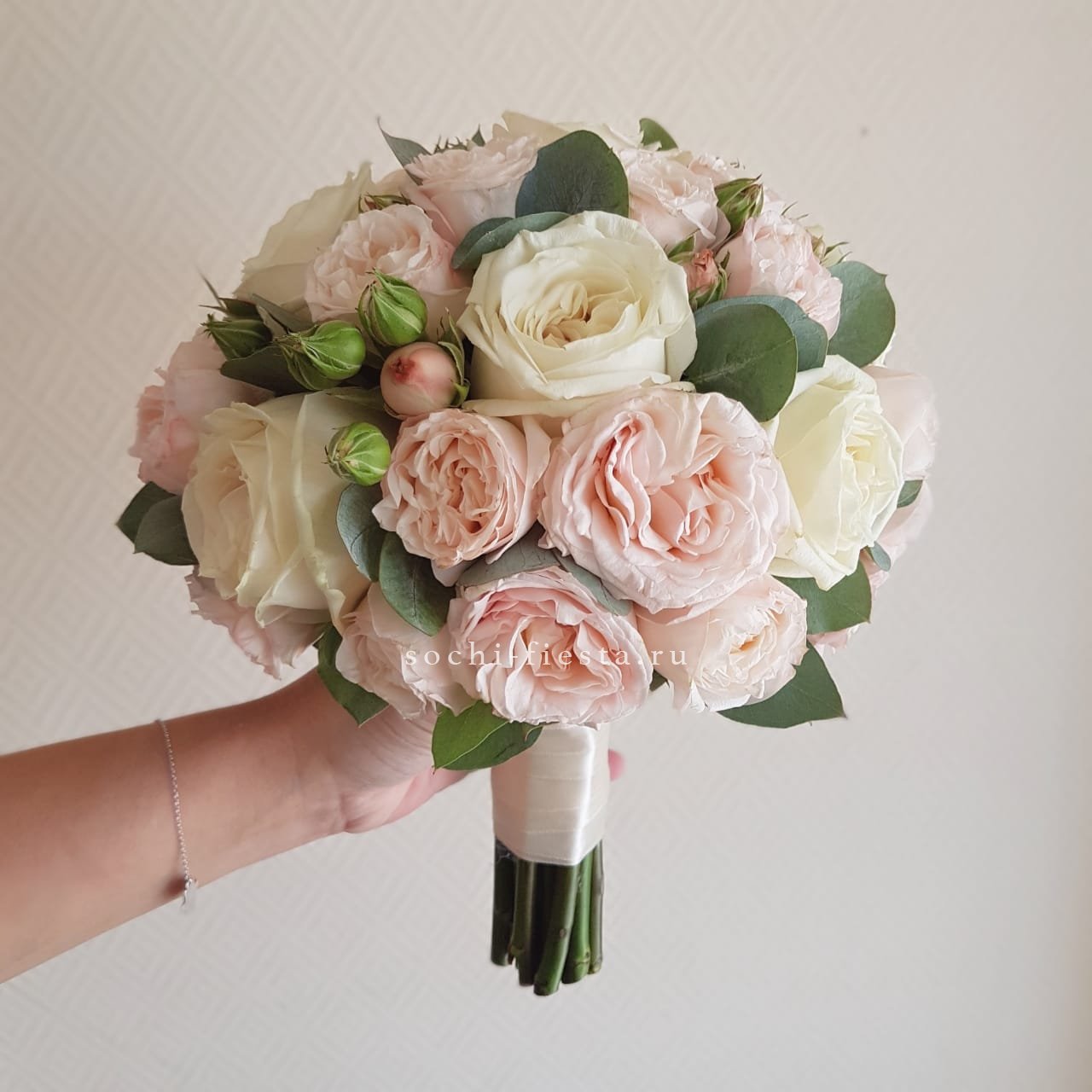 кустовые пионовидные розы Бомбастик, одноголовая пионовидная роза (или замена вне сезона на кустовую пионовидную), диантусы, эвкалипт, лента.