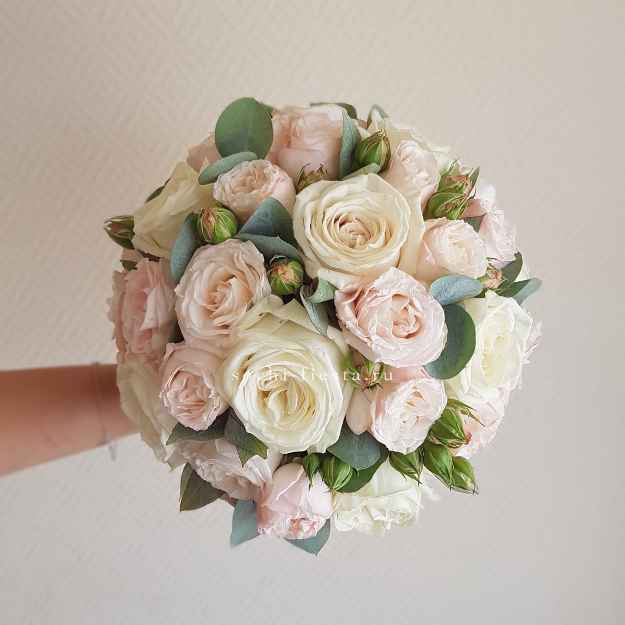 Воздушная сферическая форма с плотной укладкой кремовых и белых бутонов. Пионовидные розы Бомбастик создают объемную текстуру, а диантусы добавляют детали по всей композиции.