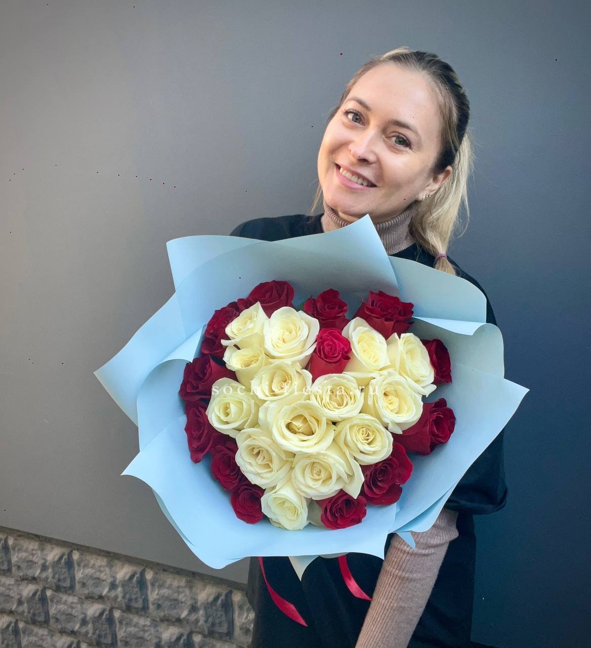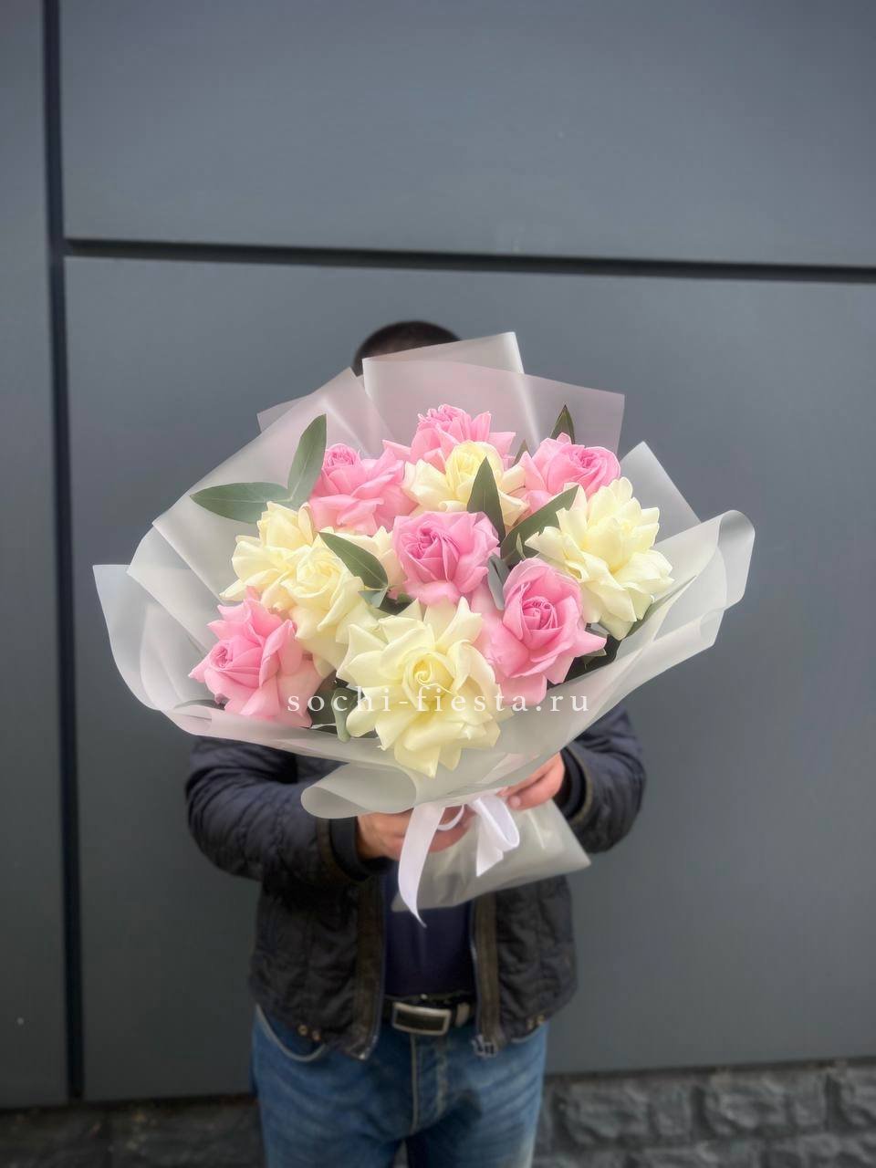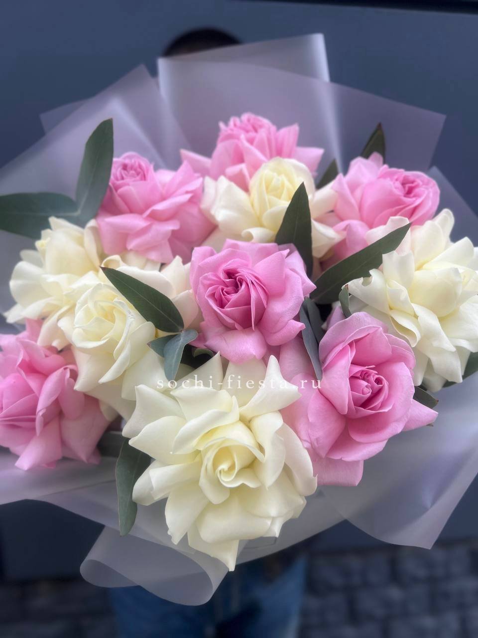 Мягкая игра оттенков между белым и розовым создает объемную глубину букета. Пятьдесят один бутон выстраивается в плотную структуру, где каждый цвет усиливает звучание соседнего без резких границ.