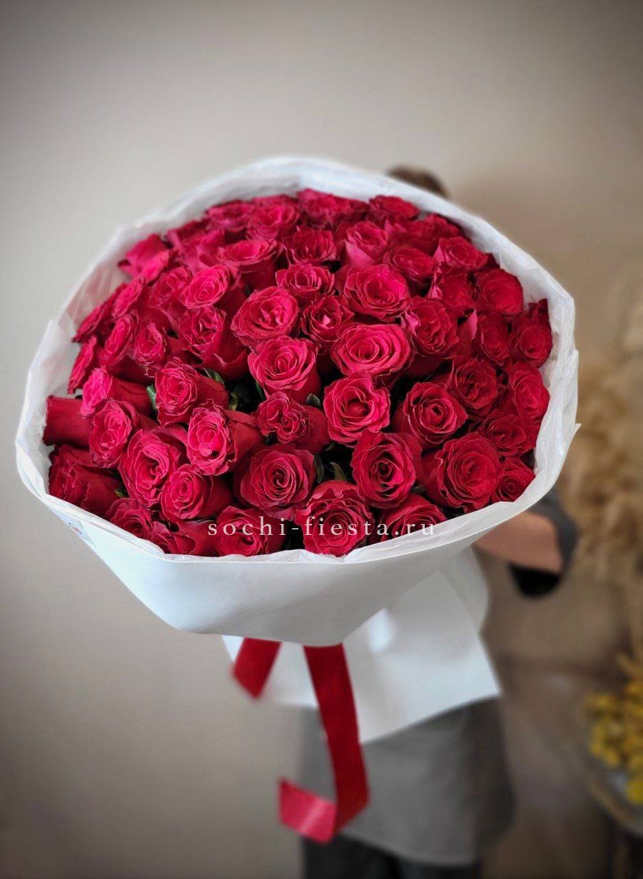 Сто одна роза белого цвета собрана в плетеную корзину и создает впечатление снежного сугроба. Такая композиция занимает пространство уверенно и притягивает взгляд своей безупречной чистотой.