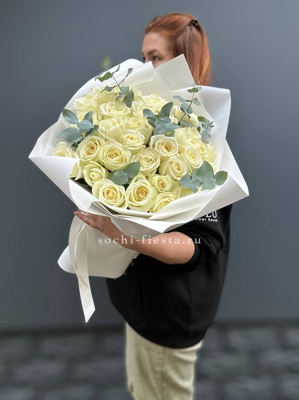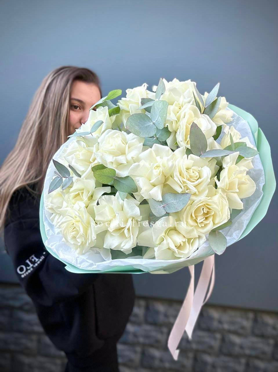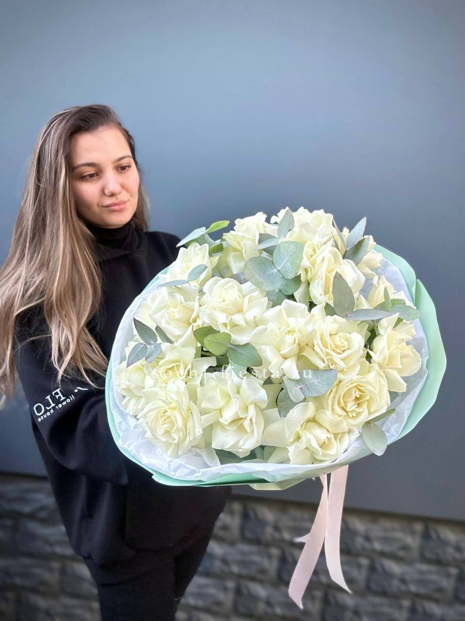 Тридцать один белоснежный бутон собран в плотную округлую форму и дополнен серебристыми ветками эвкалипта. Белый крафт сохраняет природную графику композиции и подчёркивает её объём.