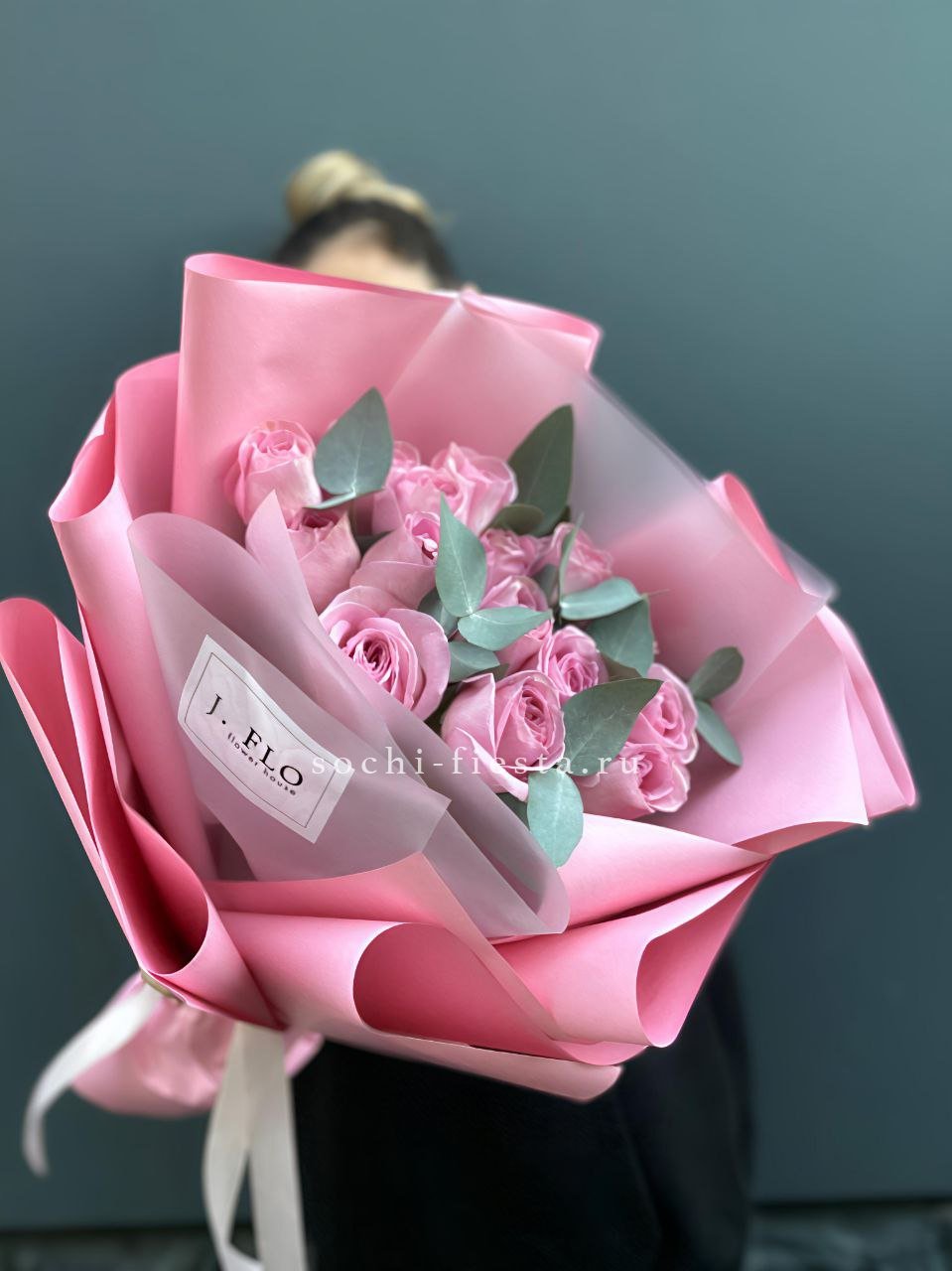 Сто одна роза в розовой гамме выстраивается в масштабную композицию. Такой букет заполняет всё видимое пространство и создаёт впечатление цветочной инсталляции с первого взгляда.