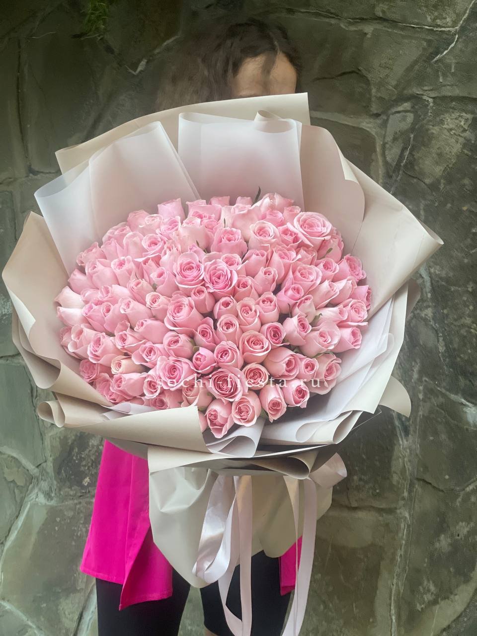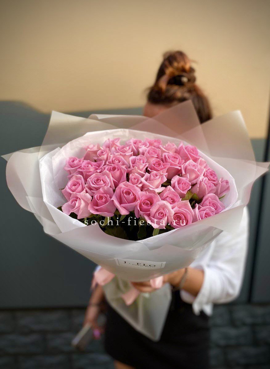 33 розовых роз, эвкалипт, лента, упаковка.