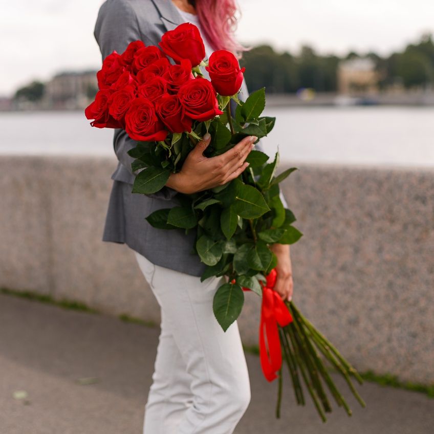 Пятнадцать красных роз на длинных стеблях выглядят графично и выразительно. Насыщенный оттенок лепестков держит внимание и создает яркий акцент.