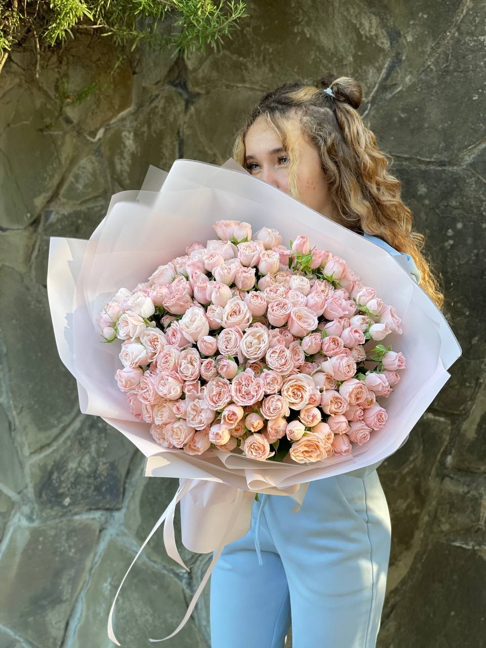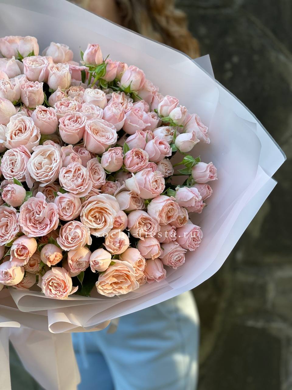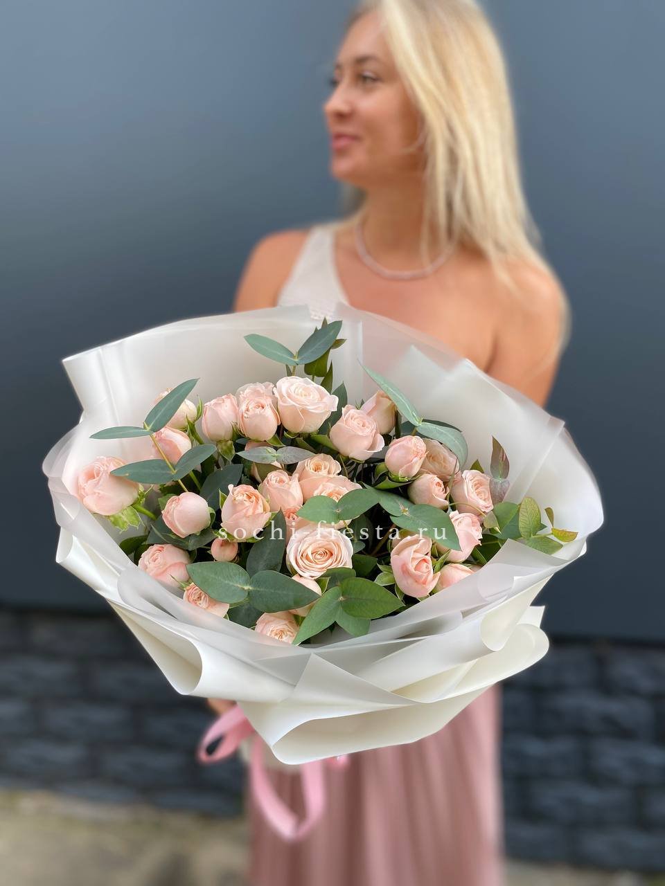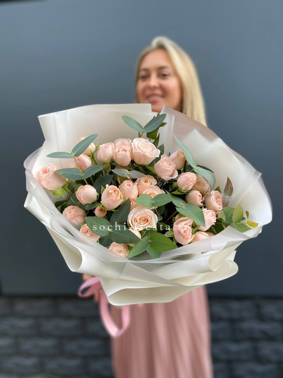 Свежий букет с множеством мелких бутонов образует воздушное облако. Кустовые розы собраны так, что композиция кажется легкой и подвижной, словно только что сорвана в саду.