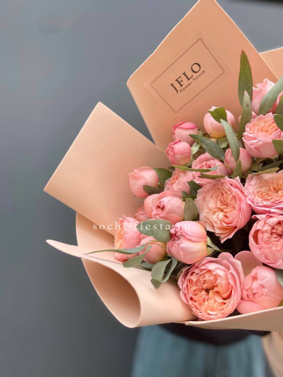 яркий букет из 9 пионовидных кустовых роз с эвкалиптом.