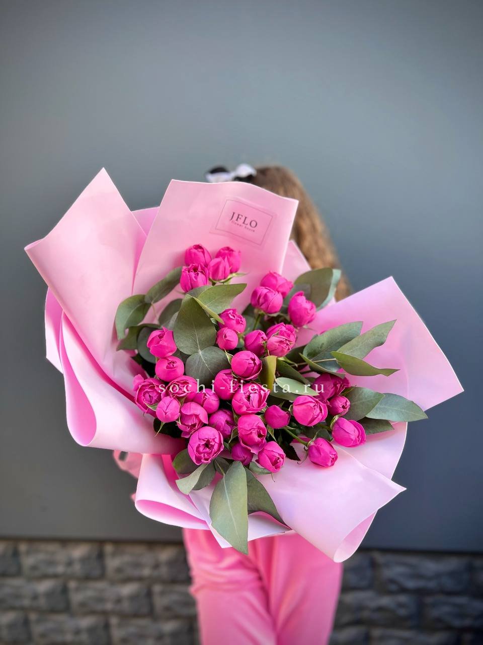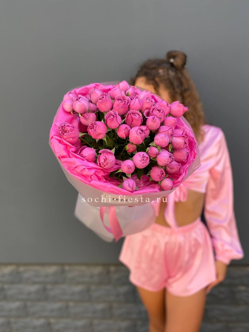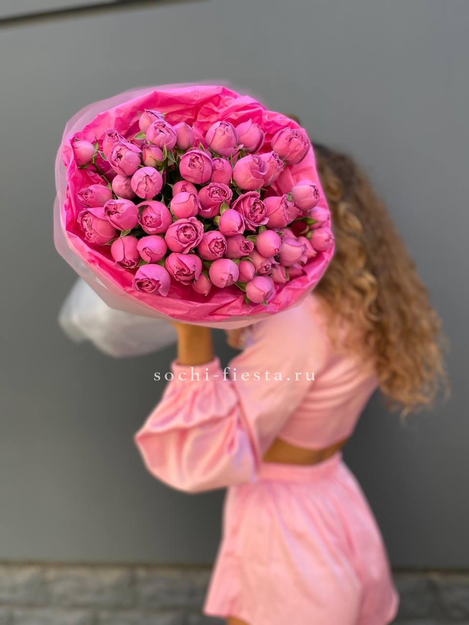 пионовидные розы кустовые мисти баблс в малиновом оформлении.