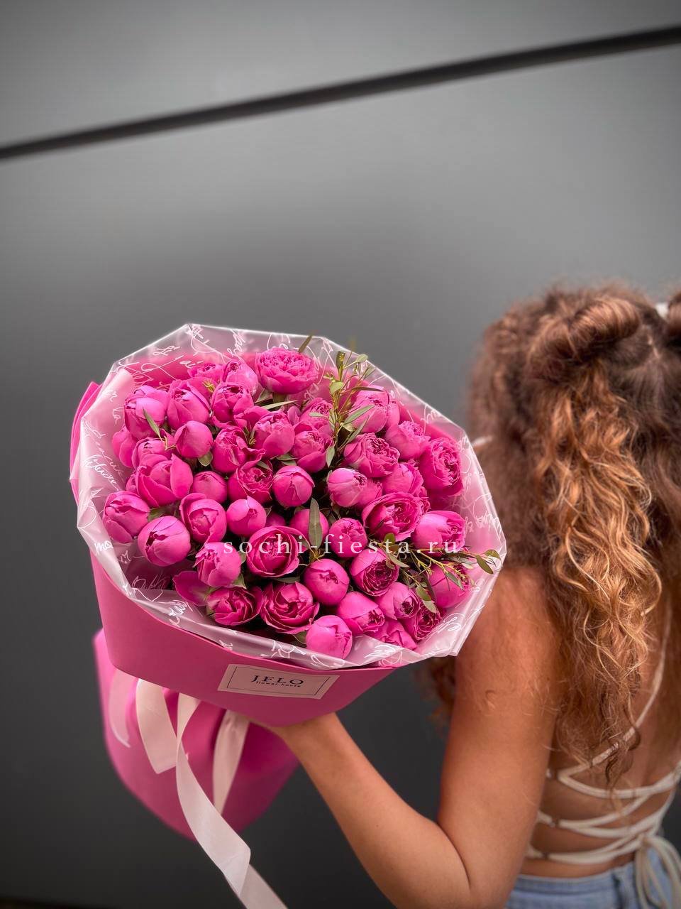 19 веток  пионовидных роз мисти баблс, лента, дизайнерская упаковка.