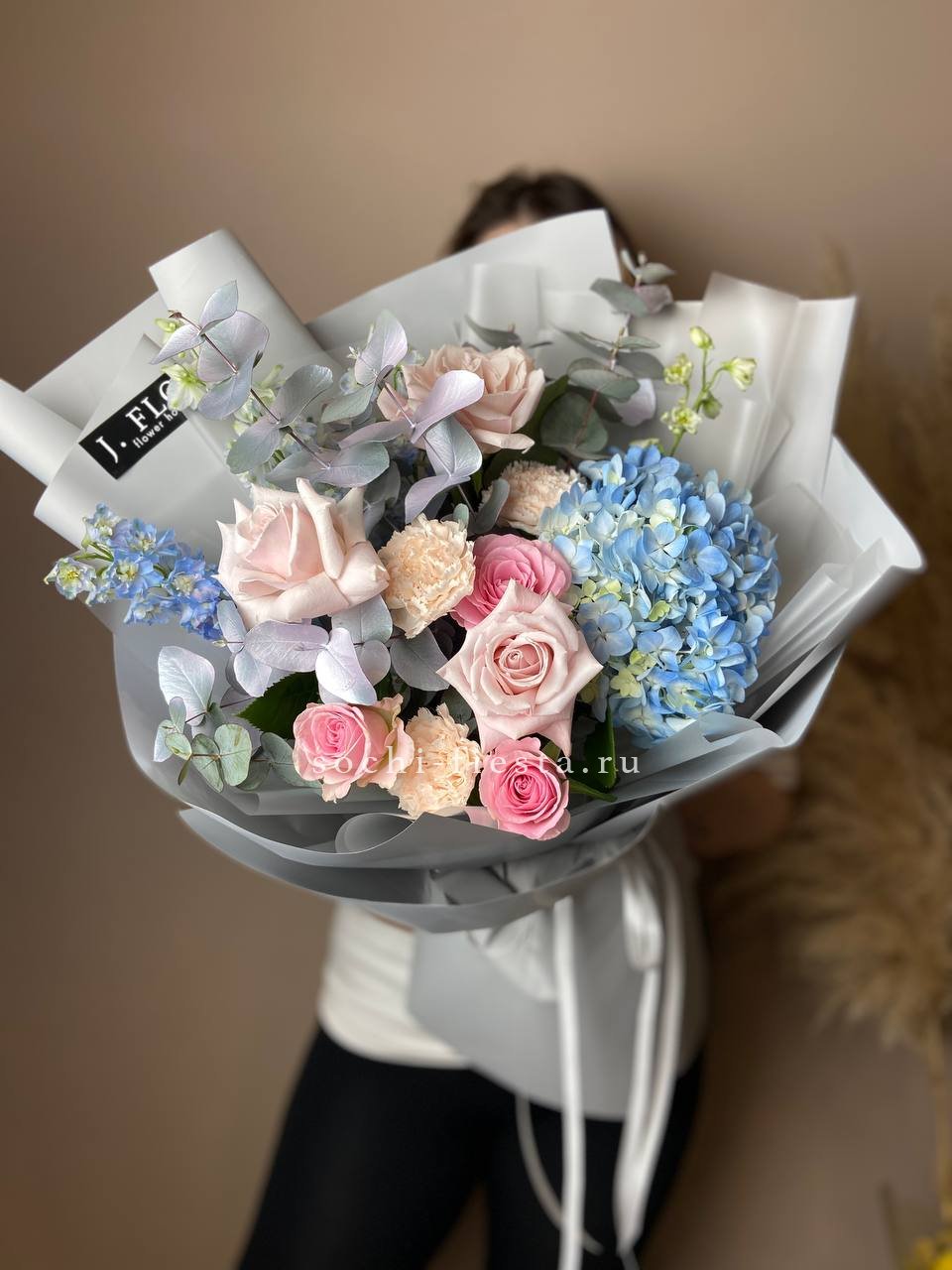 гортензия, розы джумилия, бомбастик, альстромерия, маттиола, чико, авторское оформление.