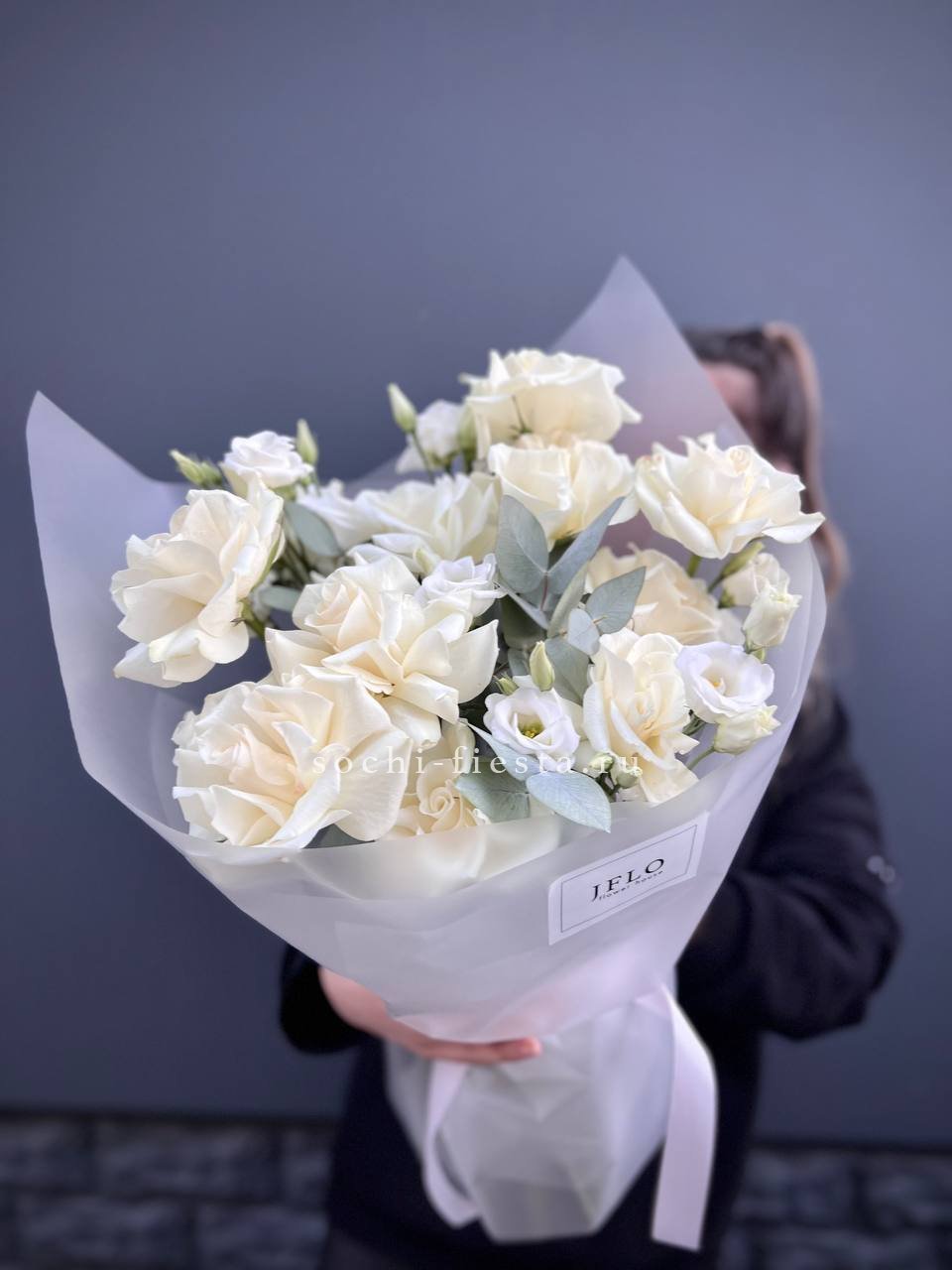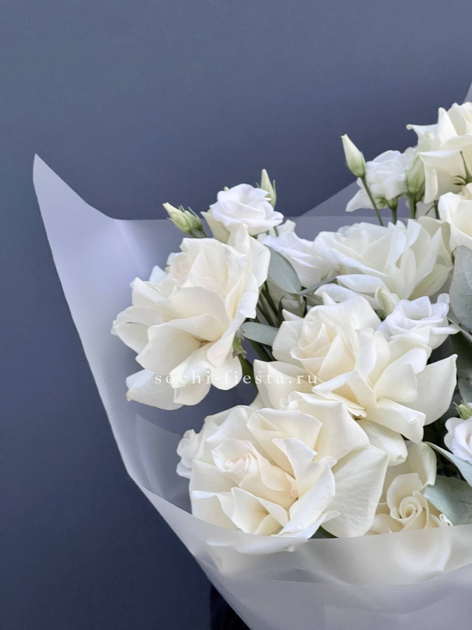 Белоснежные розы собраны в плотный круг и дополнены воздушными соцветиями кустовой хризантемы. Эвкалипт добавляет свежести и завершает композицию мягкими серебристыми оттенками. Букет держит форму и долго сохраняет безупречный вид.