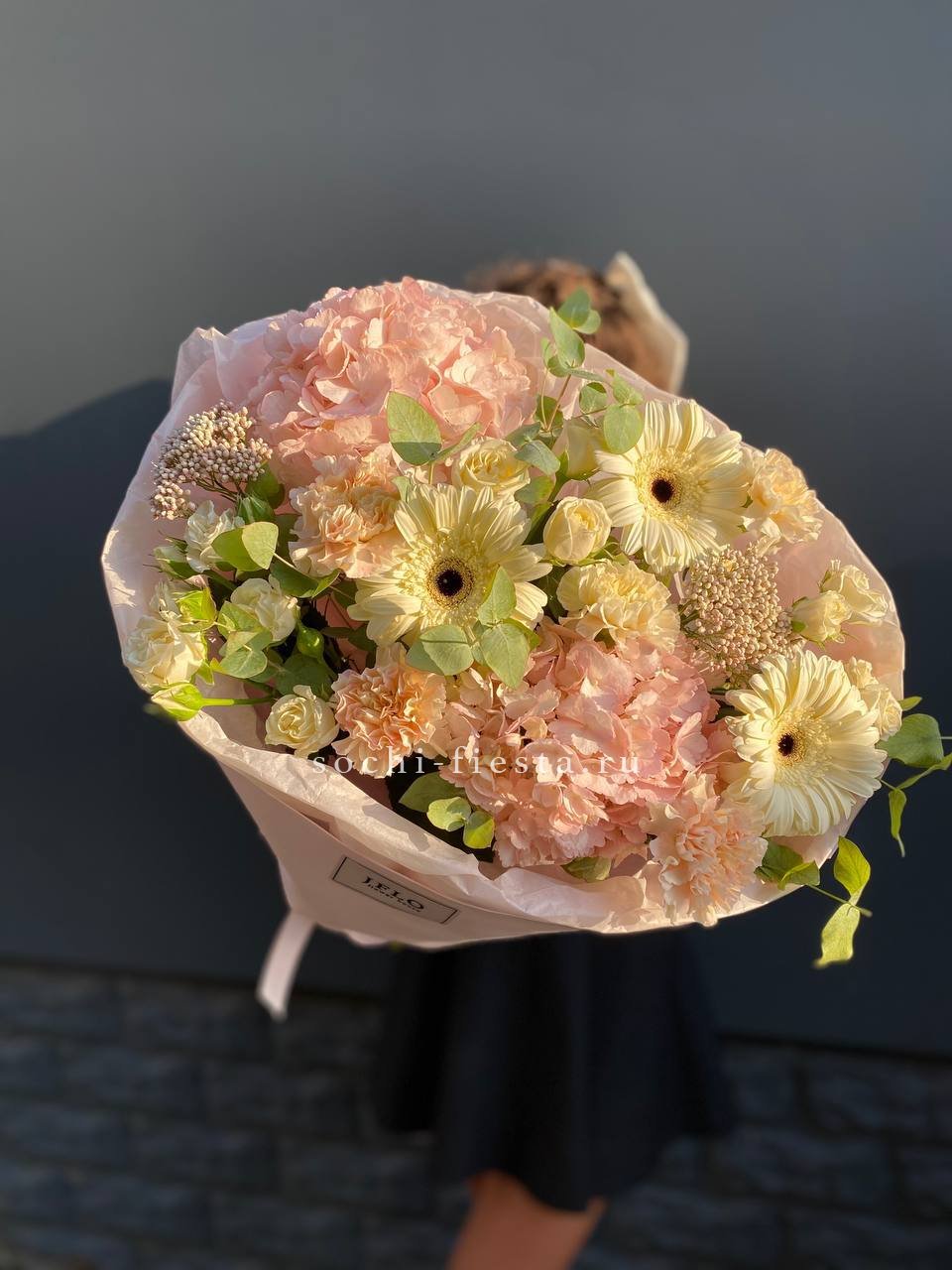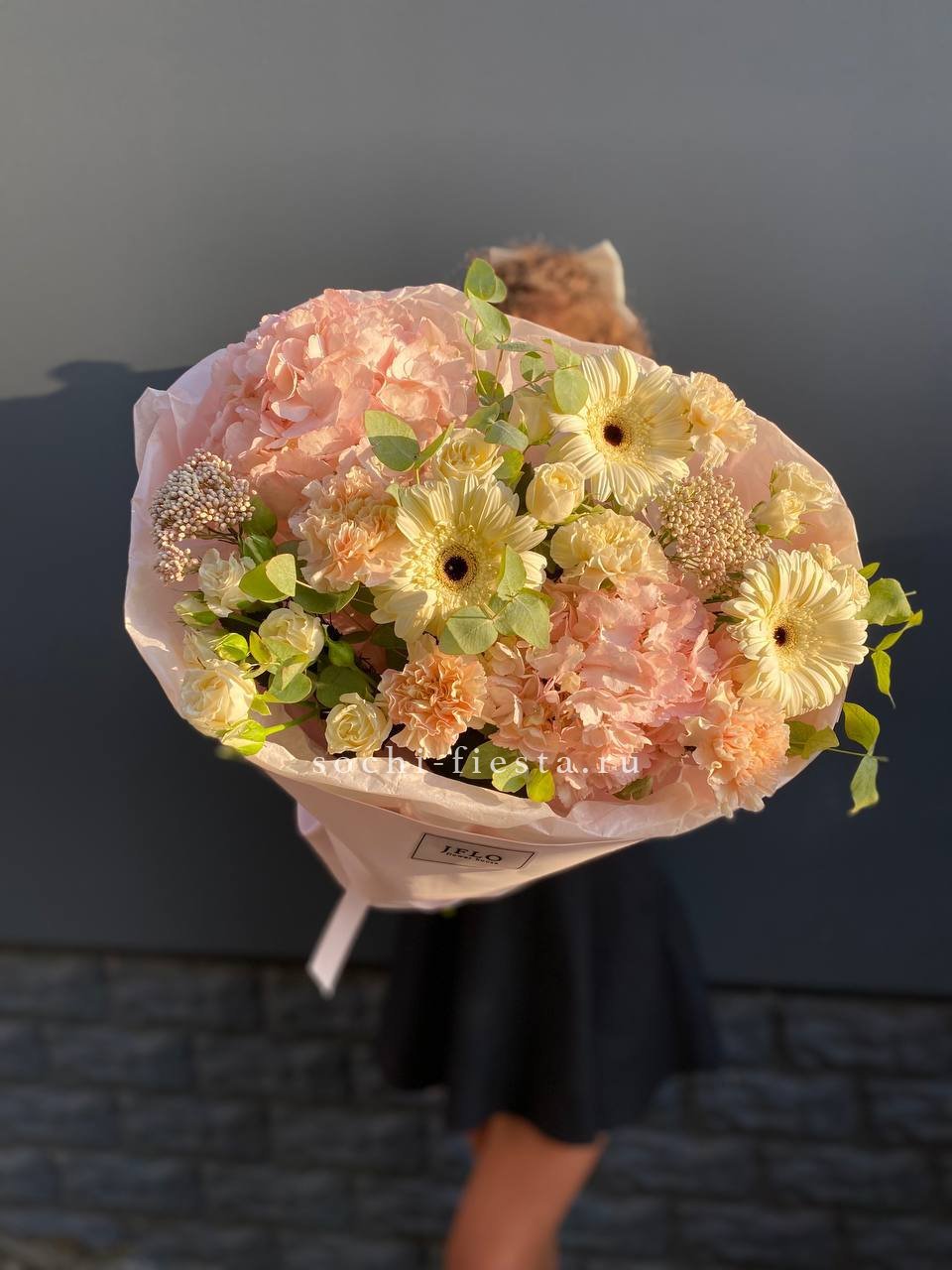 Плотная сборка с пышными соцветиями гортензии и яркими герберами создает объемный силуэт. Маттиола и лимониум добавляют воздушности по краям, а диантусы заполняют центр мягкими переходами.