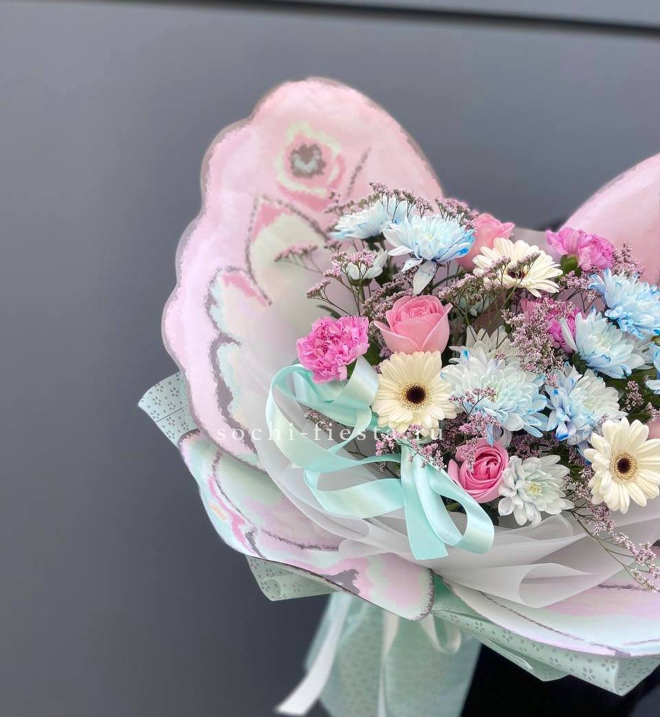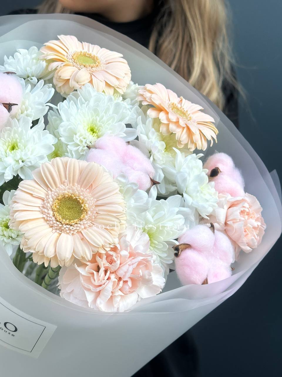 герберы, хризантемы, статица (аналог), диантусы, хлопок, упаковка.