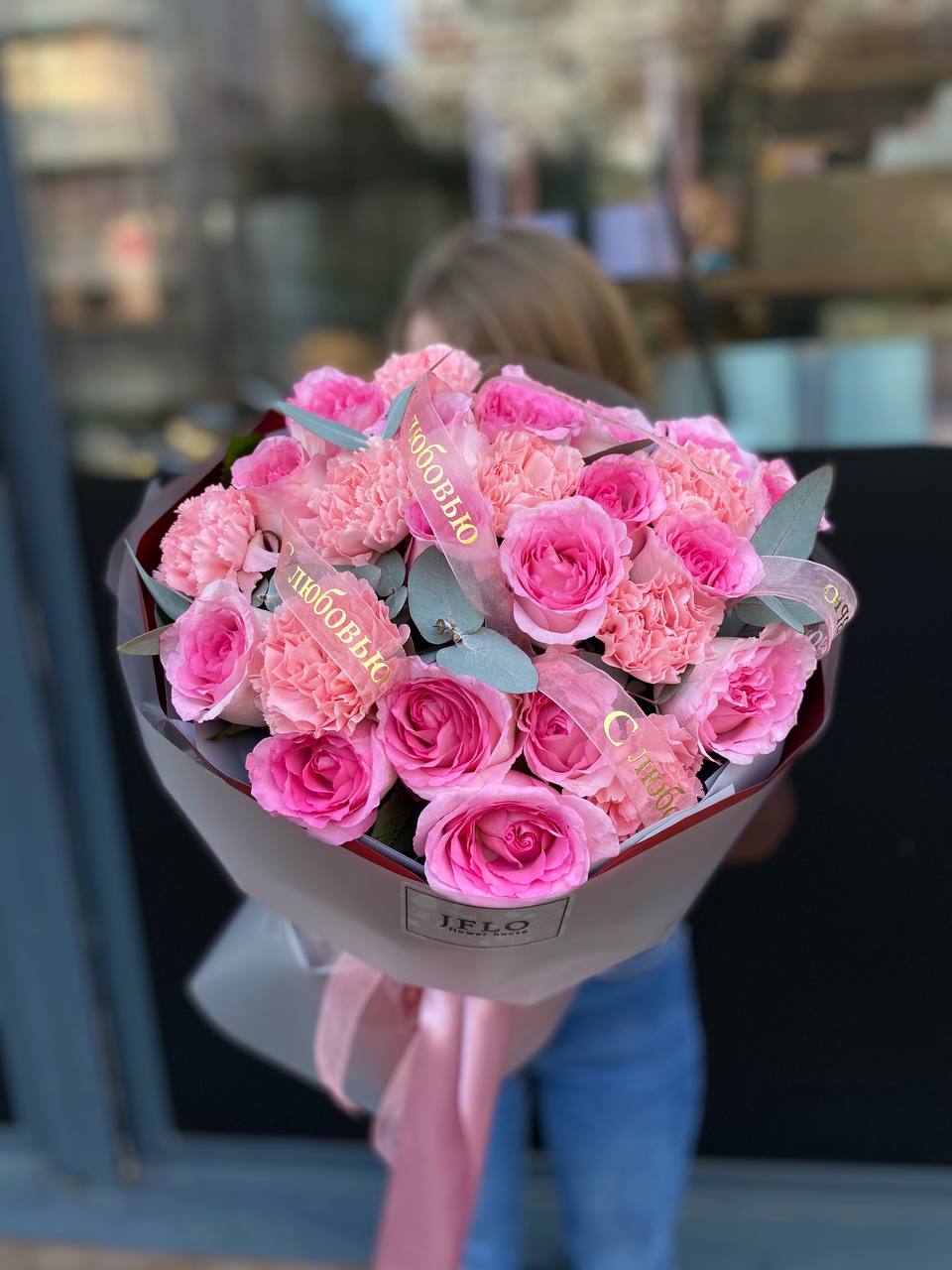 Диантусы создают воздушную текстуру между крупными бутонами роз в розовой и белой гамме. Эвкалипт добавляет графичности и свежести всей композиции.