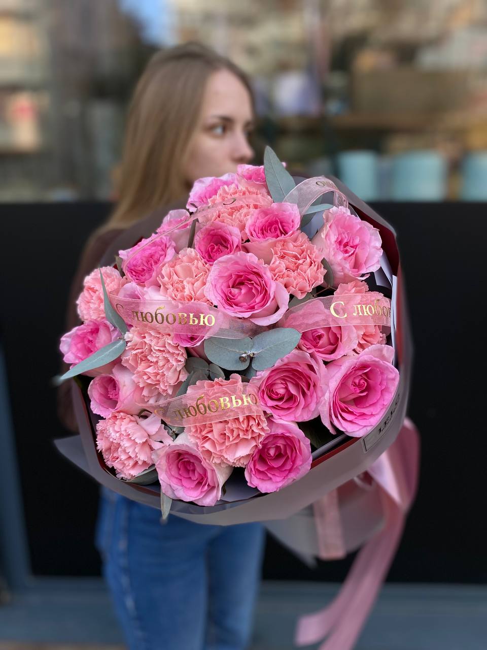диантусы, розовые розы, белые розы, эвкалипт, лента, крафт или дизайнерская пленка.
