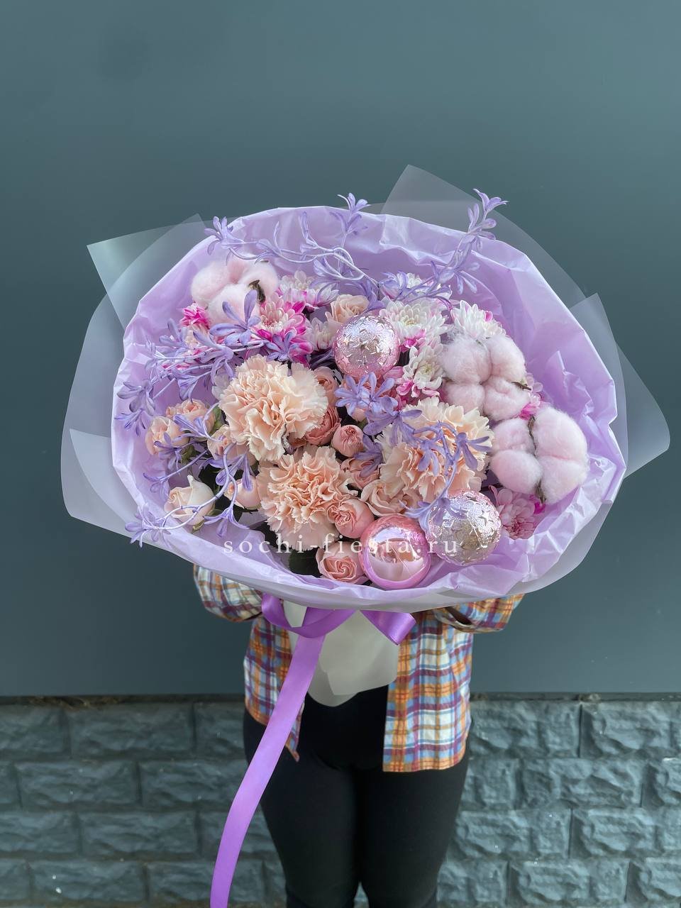 Сиреневые хризантемы и диантус выстраиваются в плотную композицию с новогодним декором. Бомбастик и хлопок создают фактурные переходы между цветами. Букет наполнен праздничным духом и зимней свежестью.