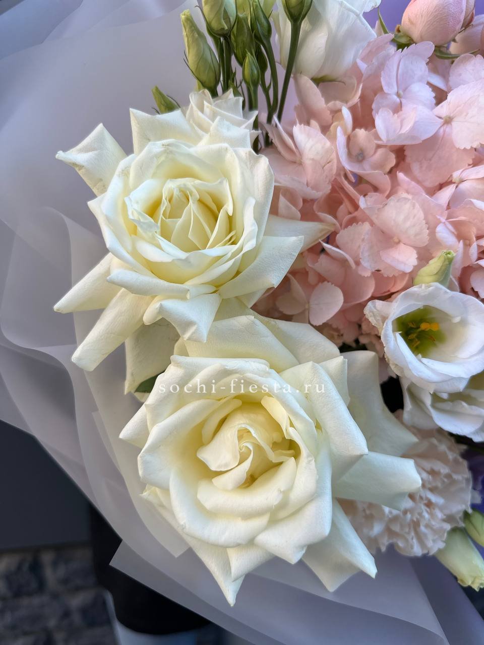 Кустовые розы и эустомы собраны в компактную форму с мягкими линиями. Сочетание нескольких оттенков создаёт живописный эффект без лишней пышности.
