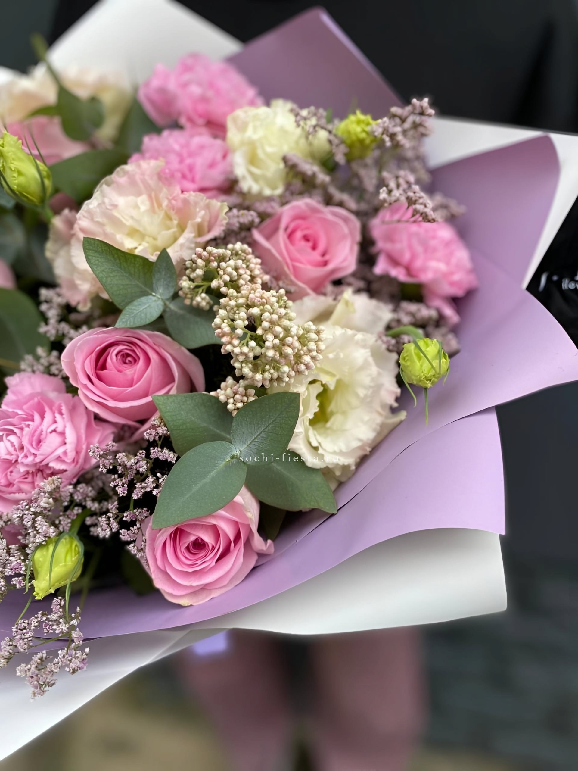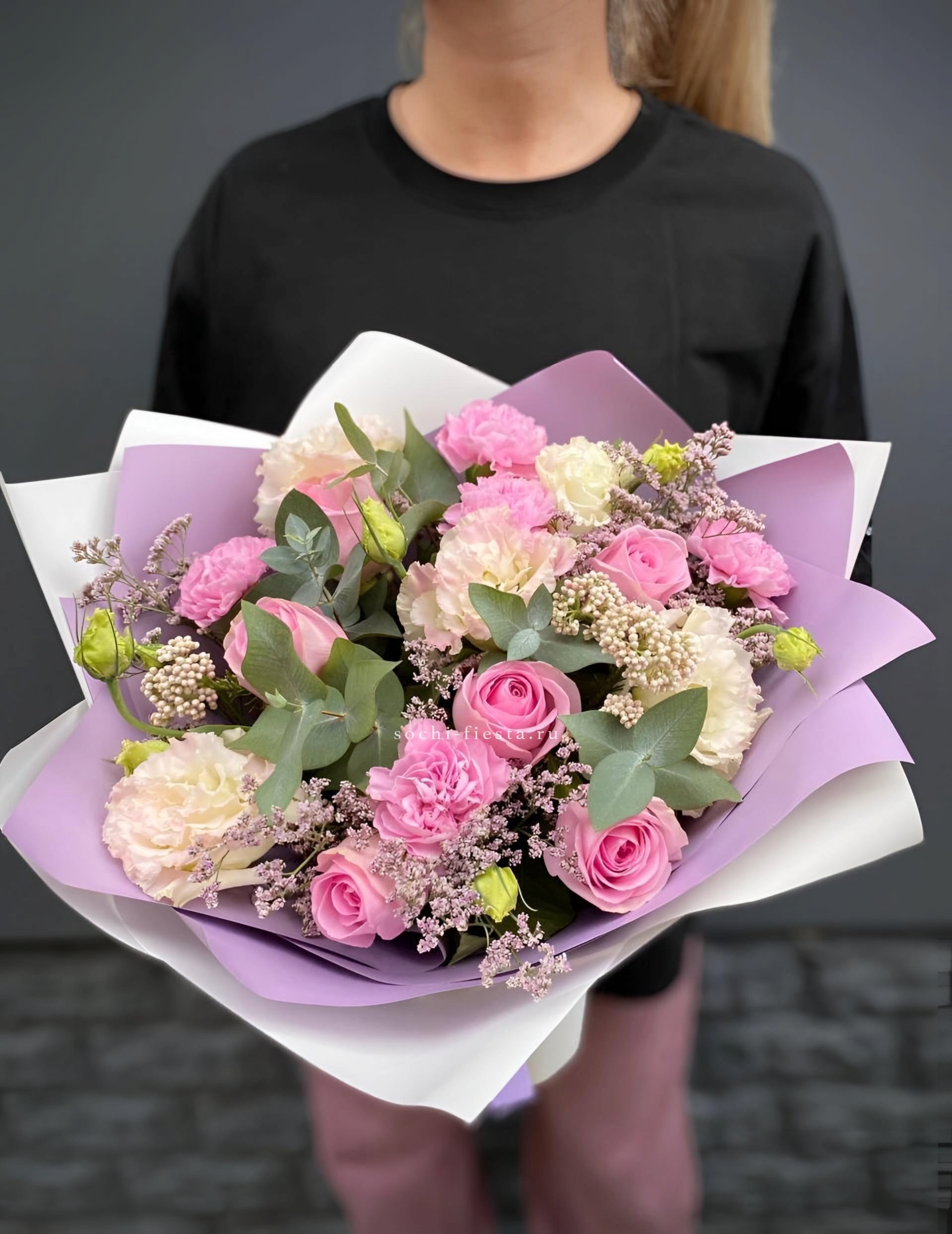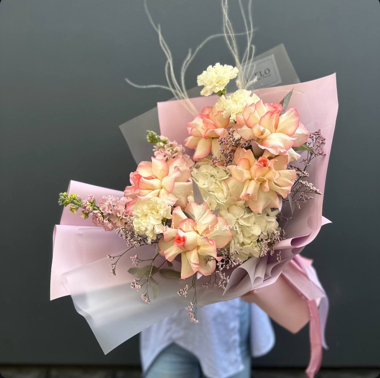 гортензия, французские розы, маттиола, лимониум, дианстусы, эвкалипт, ковыль и дизайнерская упаковка.
