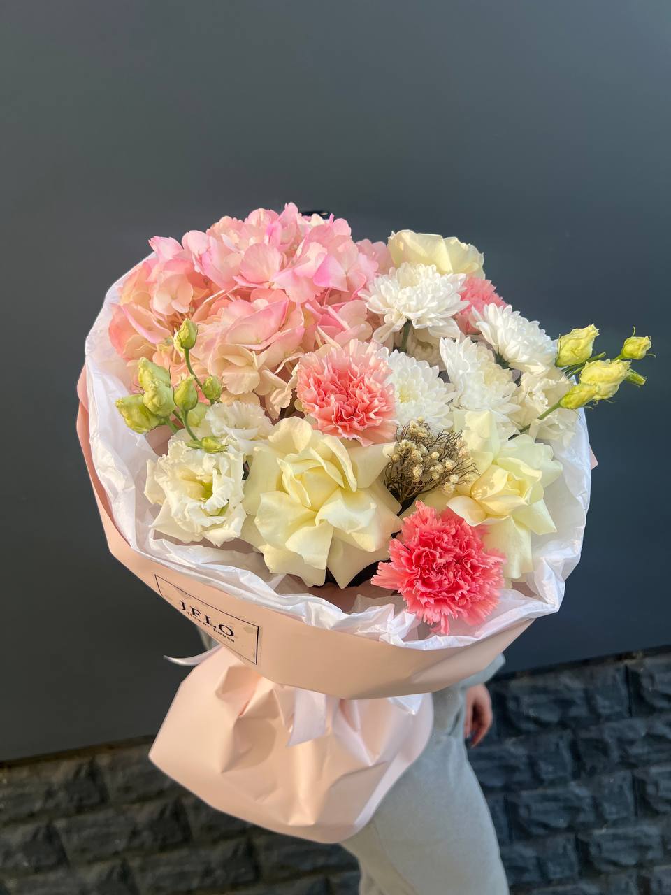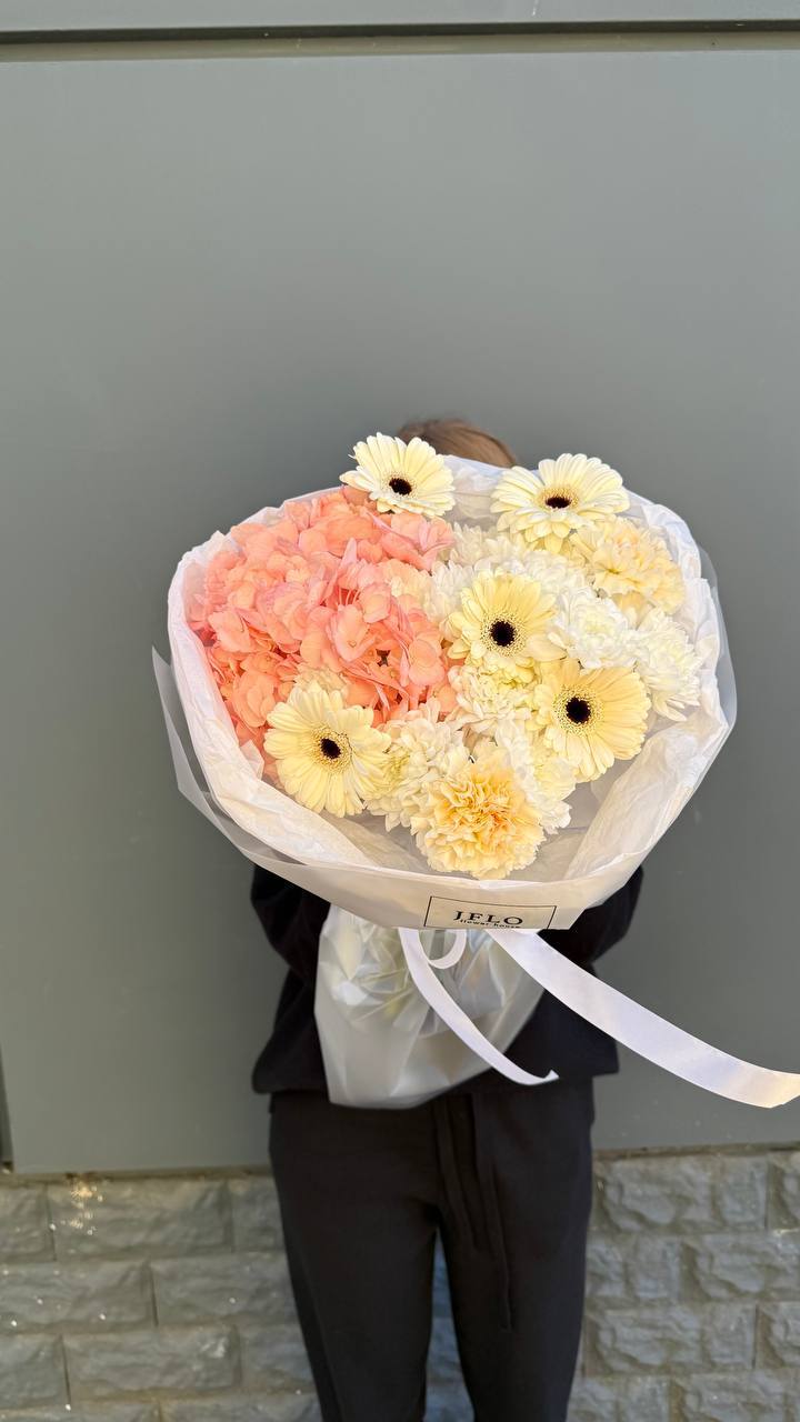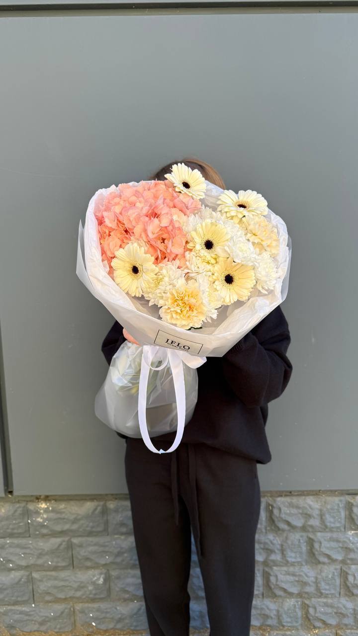 Гортензия задаёт пышную основу, а маттиола и лимониум наполняют букет текстурной глубиной. Французские розы и ковыль создают динамику, которая оживляет композицию и придаёт ей выразительность.