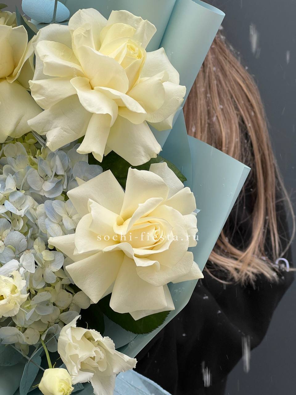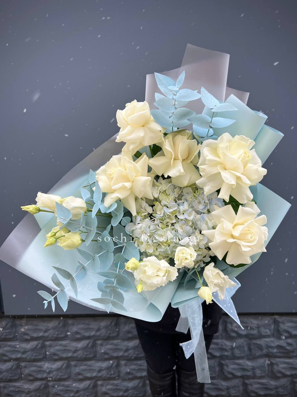гортензия, розовые розы, кустовые розы, маттиолы,, лимониум лента и дизайнерская пленка.