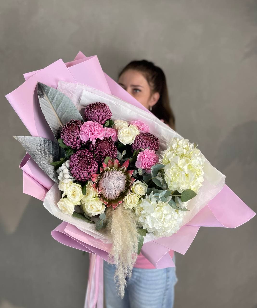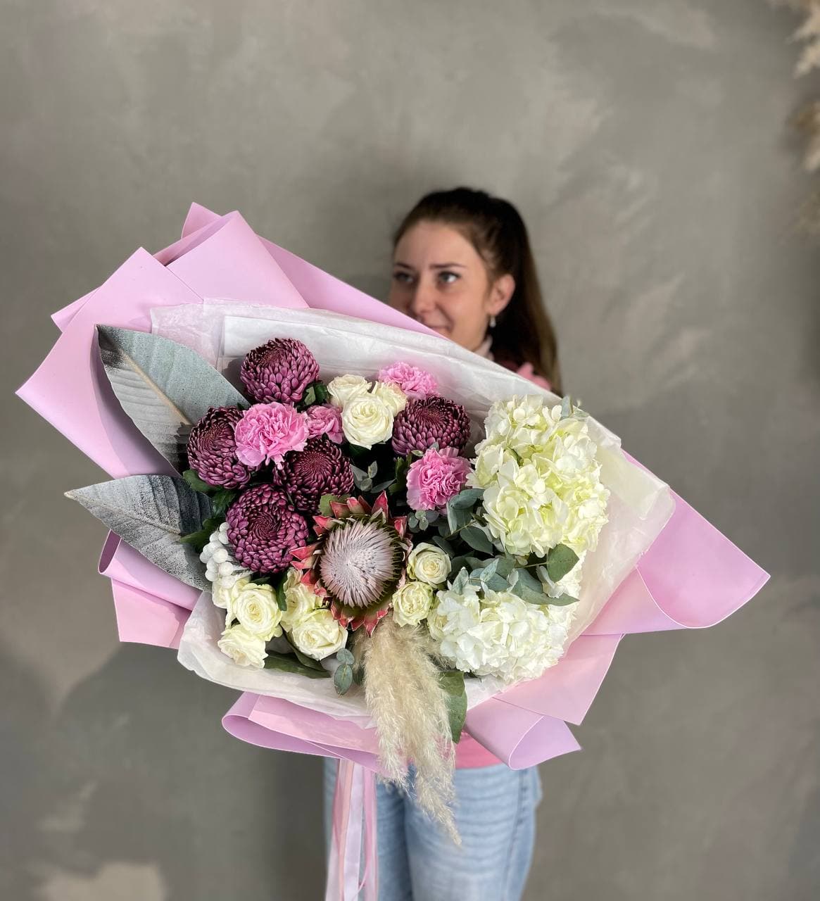 гортензия, протея, бруния, диантусы (или эустома), хризантема Бигуди, пионовидная кустовая роза, эвкалипт, листья стрелиции, помпас, дизайнерское оформление.