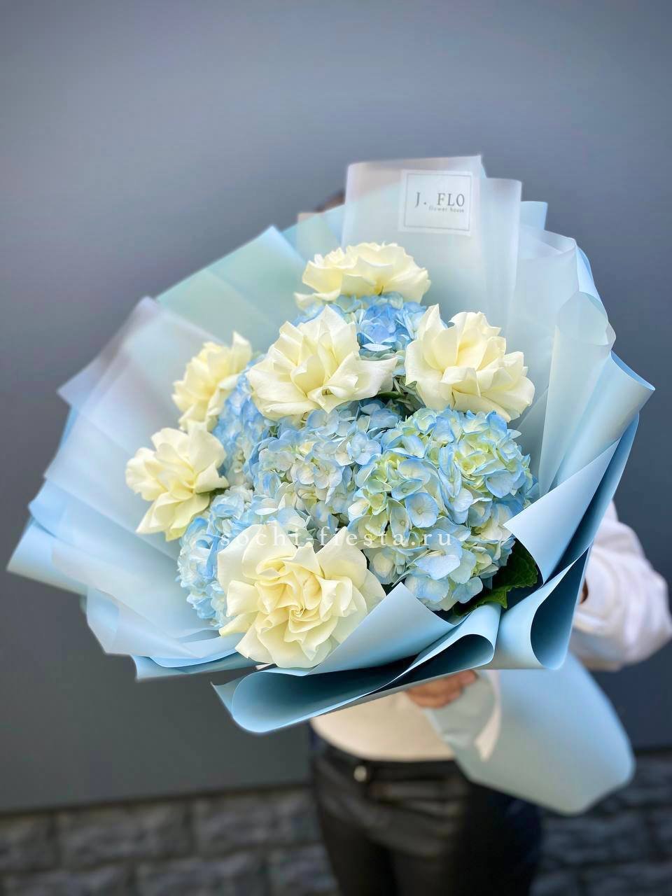 мисти баблс, гортензия, розовая роза, диантус, маттиола, эвкалипт, эустома в нежном оформлении.