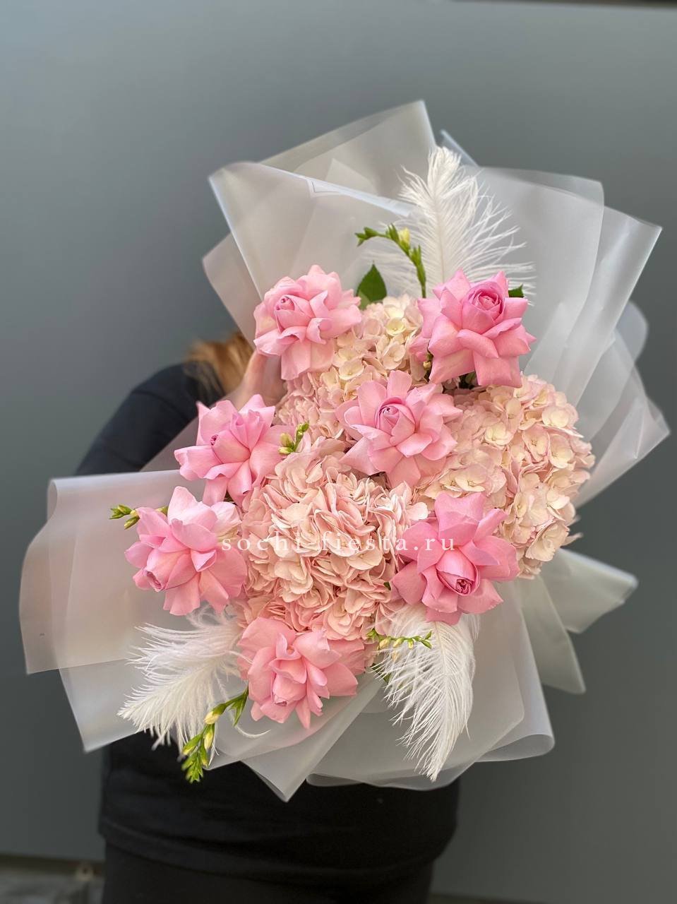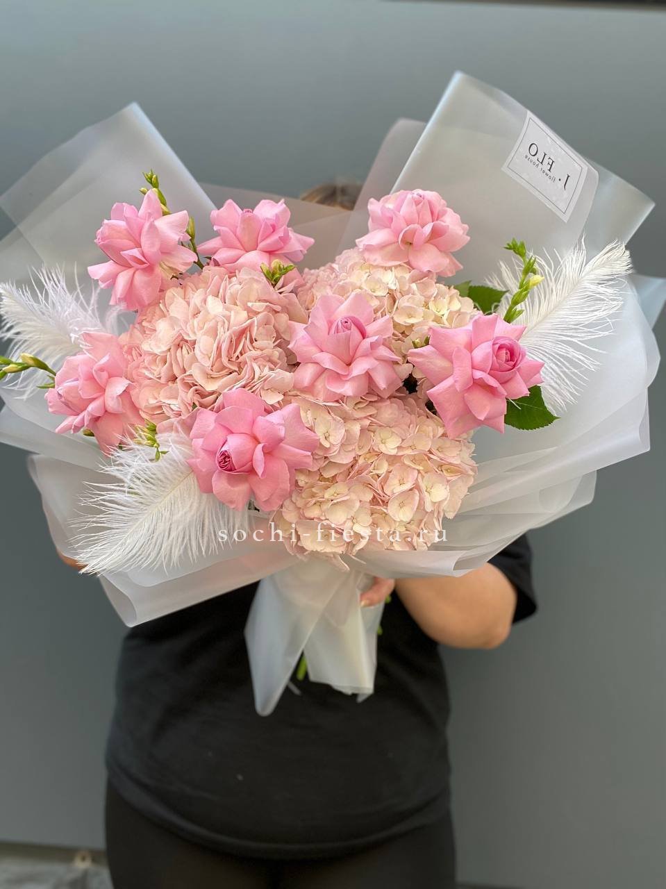 гортензия, диантус, кустовая пионовидная роза, эустома, вспомогательные цветы, эвкалипт, лента, дизайнерская упаковка.