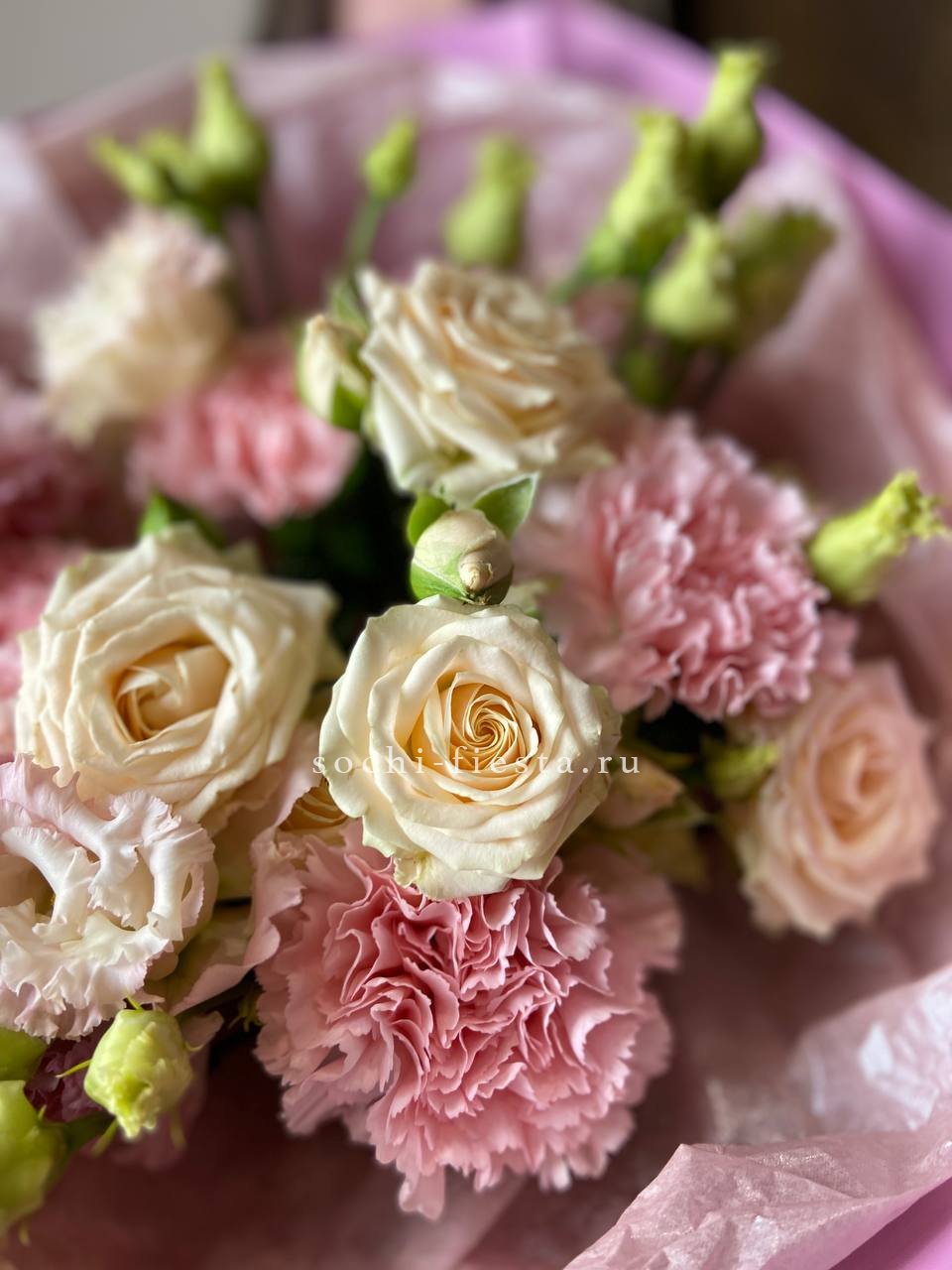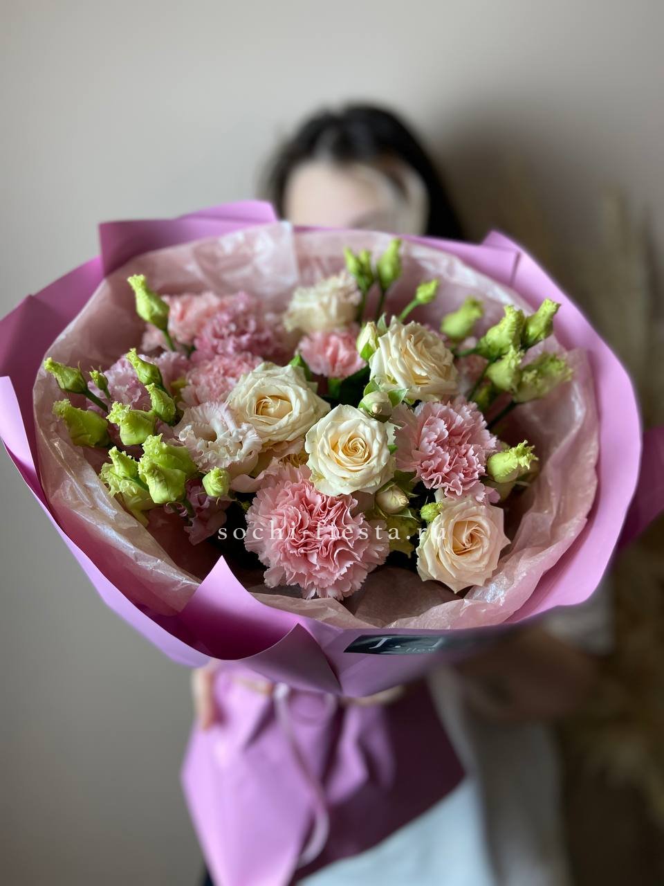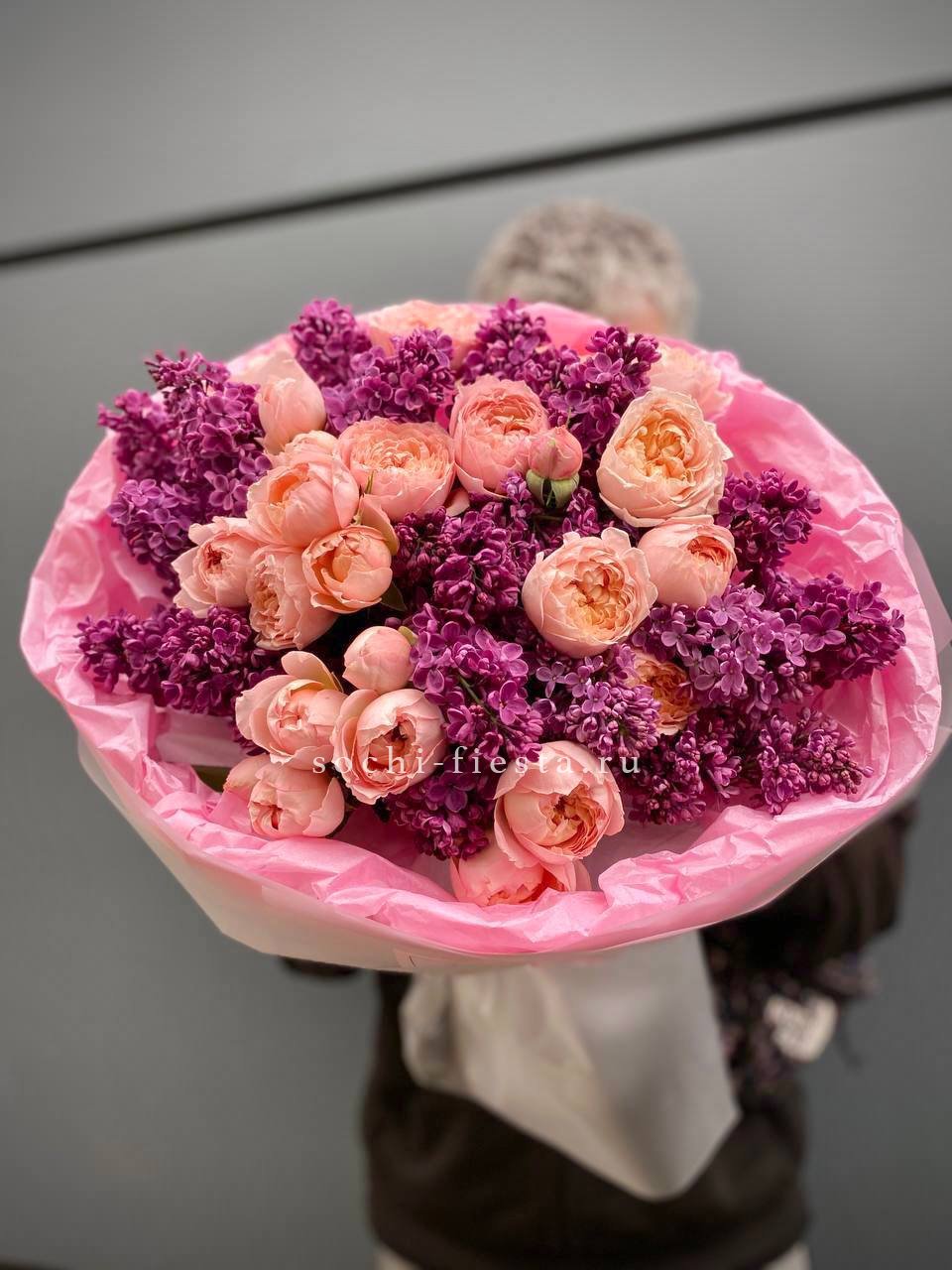 сирень, кустовые пионовидные розы, тишью, пленка, лента.