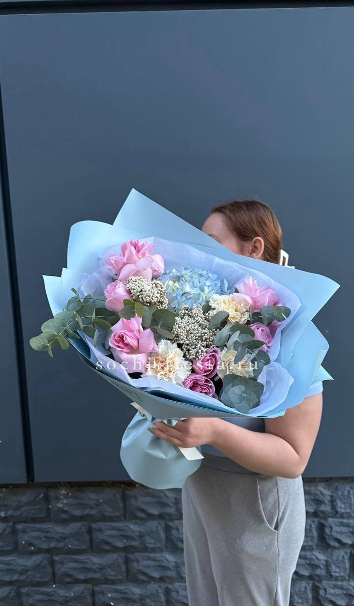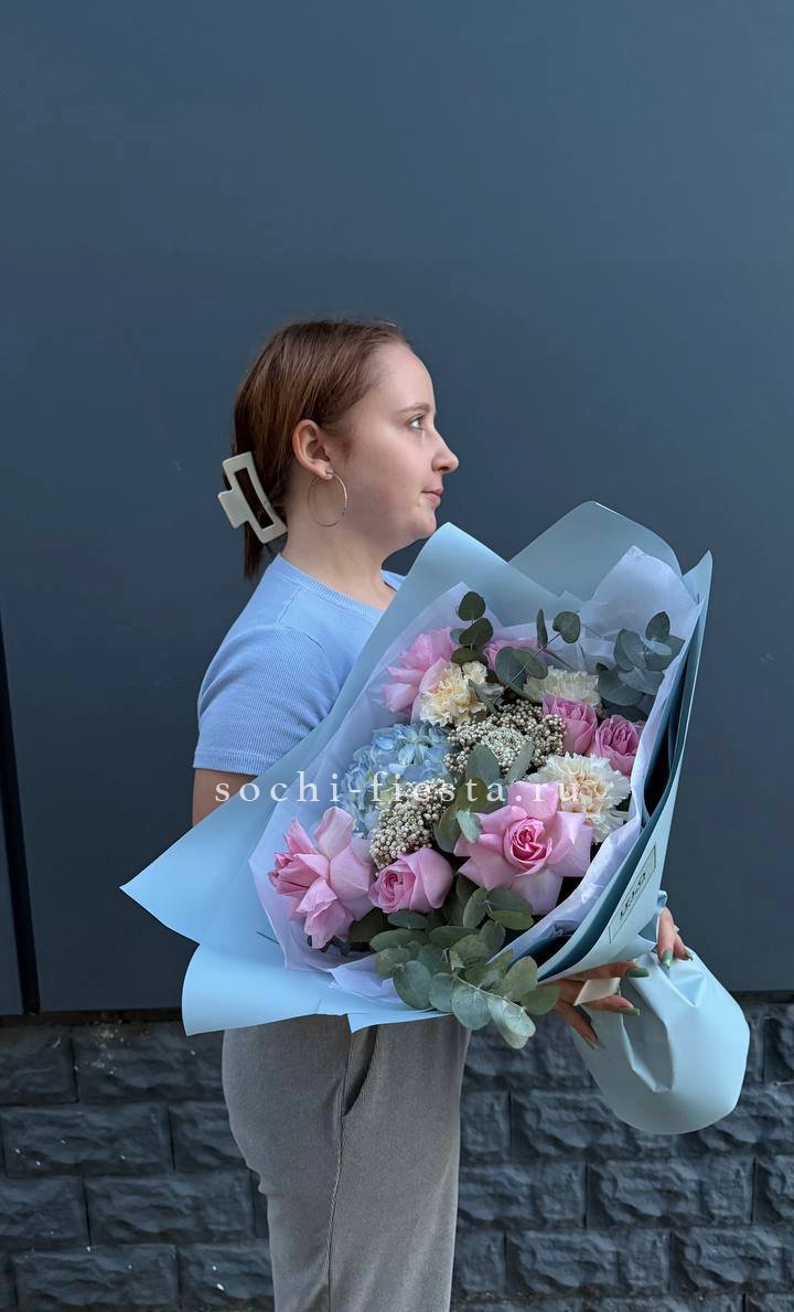 гортензия, розы, диантусы, хризантема, пионы (или пионовидные розы), эустома, корзина. Состав может меняться, в зависимости от сезона.