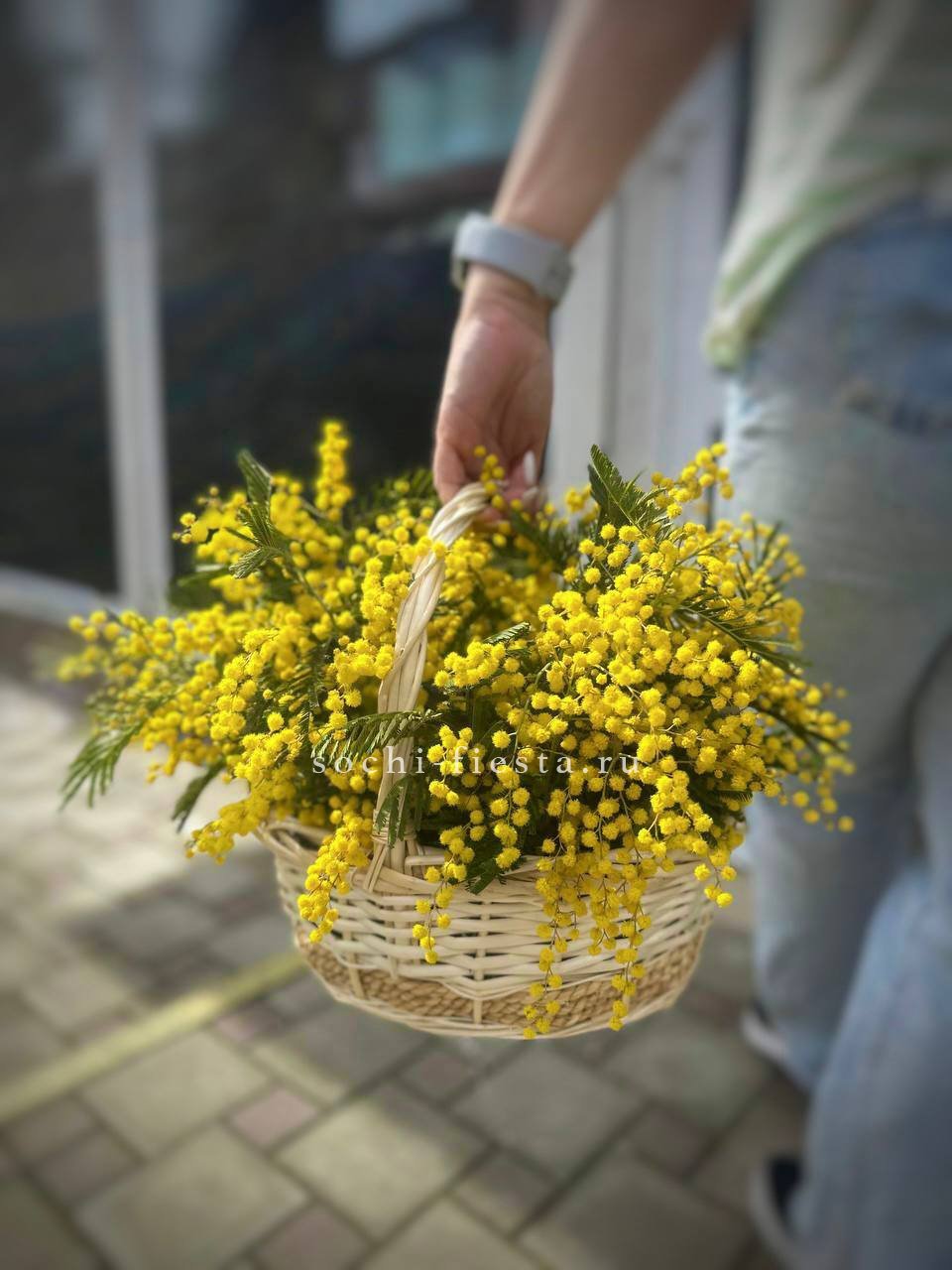 Солнечные шары мимозы собраны в пышную корзину. Яркий жёлтый цвет мгновенно поднимает настроение и напоминает о первых тёплых днях.